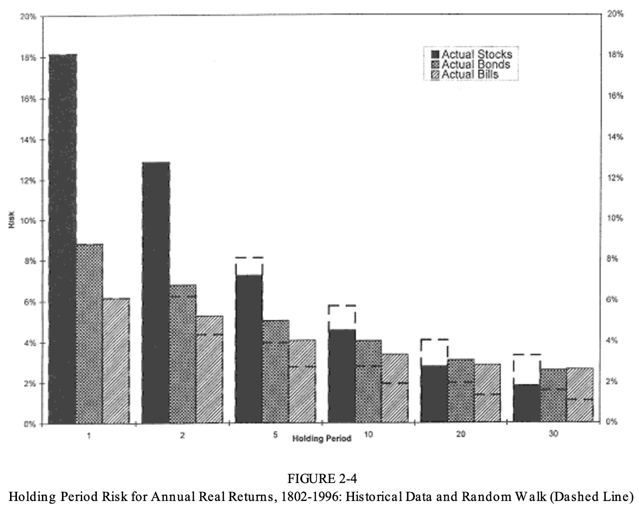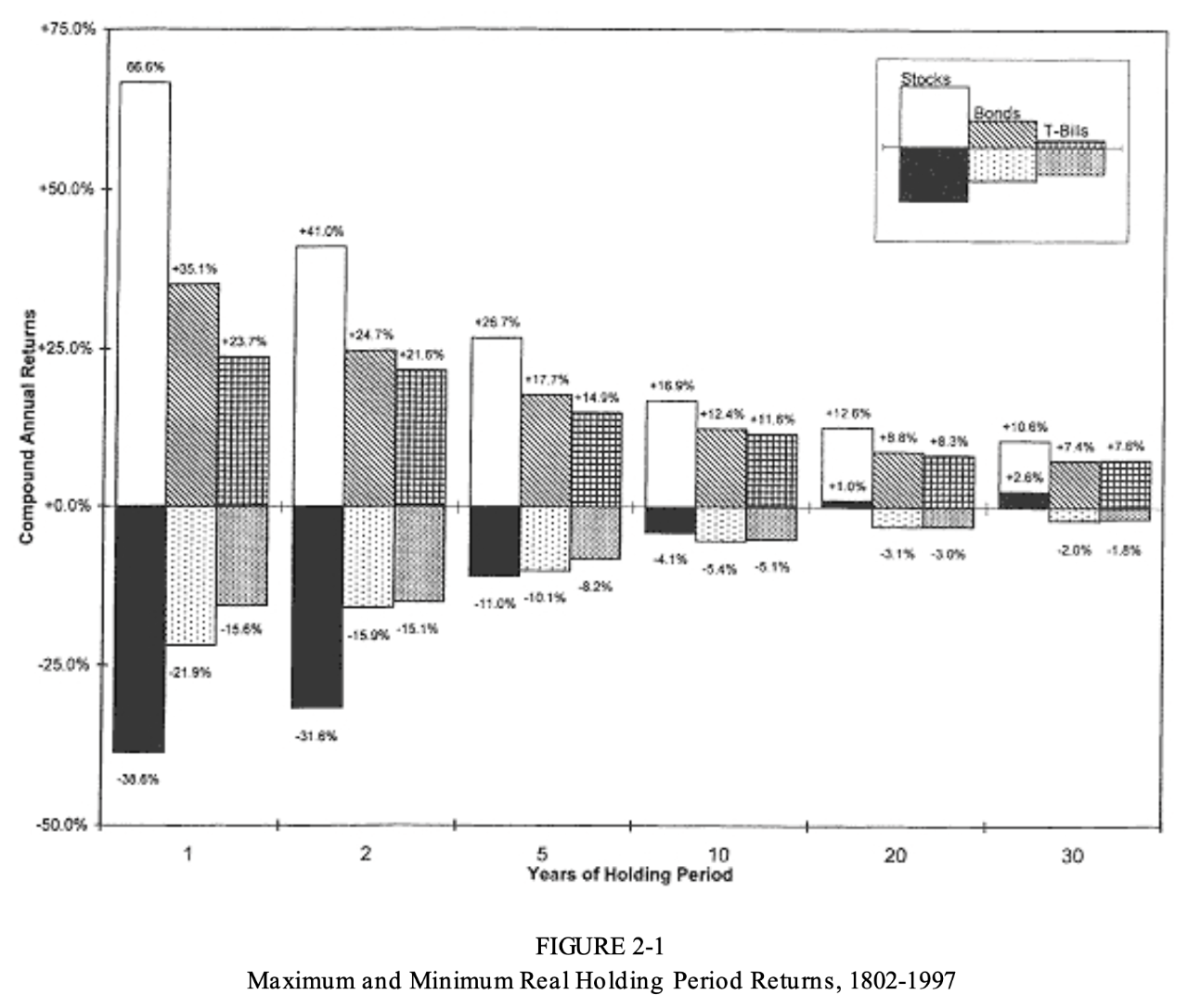 | 今天我们继续分享杰瑞米.西格尔教授《Stock for the long run》中的一些精华章节总结,这一篇分享的是对大类资产风险的定义。资产管理行业的核心,就是管理风险,以较低的风险获得较高的收益。 通过详尽的数据分析,我们居然发现一个让人惊讶的事实:股票是几乎风险最低,而非最高的资产。风险是以夏普比率进行衡量的,拉长时间看,股票的夏普比率很高,但有一个重要的前提:时间! 也就是说,只要持有时间足够长,股票几乎可以等同于一个无风险的资产,这是超越我们传统思想的。本文由点拾投资实习生谢翔宇整理总结,感谢他做的贡献,以下是我们的全文总结: 如果说资产管理是铁,那么风险与收益就是钢。 明确了风险与收益,就能决定对投资者而言最佳的资产组合,但是他们的二者的关系是暧昧的。风险与收益的转换比例不像物理系数一般明确固定,而且其底层诱因以及相应变化的不明确性,也让人们无法通过控制变量来研究。 因此,唯一可以借鉴的手段只有不断回溯金融资产这百年的历史,只能通过以史为鉴这种贫瘠的方法来进行研究也让金融这门学问成了伪科学。 历史的选择放在今天是否能成立仍然值得打上一个巨大的问号。但是在这之中,必然有一些趋势是投资者可以借鉴的。 对浩瀚的金融历史数据库宇宙,最直观的处理与表现风险的方式,就是展现收益的下限位置。 下面这张图展示了从1802年开始30年间不同持有周期对应的收益上下限,每个区间内从左到右分别对应股票、长期债券以及短期债券的情况。