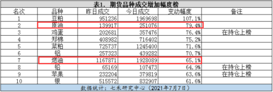 | 七禾大数据 今日,能化期货集体重挫,PTA主力合约封跌停,燃油主力合约跌超5%,SC原油、沥青主力合约跌超4%,短纤、低硫燃料油(LU)、乙二醇(EG)主力合约跌超3%。 原油成交增加79.4%,燃油成交增加65.1%