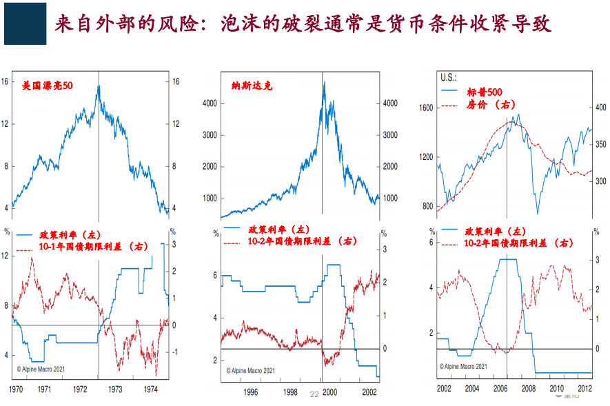 实际上港股市场上市公司股价的表现对业绩反应更敏感,或者说有业绩它股价表现就好,不像A股既对业绩敏感,也对故事敏感,甚至有时候对故事,对流动性更敏感,这点是港股跟A股不一样的地方。 我们认为港股的投资价值还是仍然需要 重视,不能用刻舟求剑的方式看待问题 所以如果我们布局业绩驱动的行情,港股是绝对是不能忽视的。 有些人说了你布局港股,港股过去好长时间也不表现,那是什么原因呢? 过去从2018年2019年一直到2020年,上市公司业绩都是一路向下的,因为业绩不好,所以它受业绩敏感(导致股价表现不好)。 如果我们判断未来业绩会好,实际上股价表现就会反过来了,我们也不能用简单的线性去看这个问题,或者说刻舟求剑看这个问题。 我们认为港股的投资价值还是仍然需要重视。 当然说到港股有些朋友说港股毕竟是一个离岸市场,所以万一国际市场环境出现变化,怎么办? 尤其美国,美股不断创新高,大家总觉得恐高,觉得美股会调整,美股有泡沫,如果美股调整,对港股肯定是有影响的。 我觉得这个担心逻辑上是合理的,但是我们的判断是美股现在要说它泡沫也许有,但是不具备泡沫破裂的条件。 关于一点,我上次4月份的时候也跟大家讲了,我们认为考虑到美股当前这样一个估值水平,对应的流动性状况,尤其是它的利率水平,以及参考美国历史上的几次市场的调整,大泡沫的生成和破裂,我们认为美股当前不具备泡沫破裂和大幅调整这样的风险。 所以这个风险不存在的话,美股调整就是一个自己动态的健康的调整,这种调整下对港股不构成一个大的系统风险,我们认为这个顾虑是可以消除的。