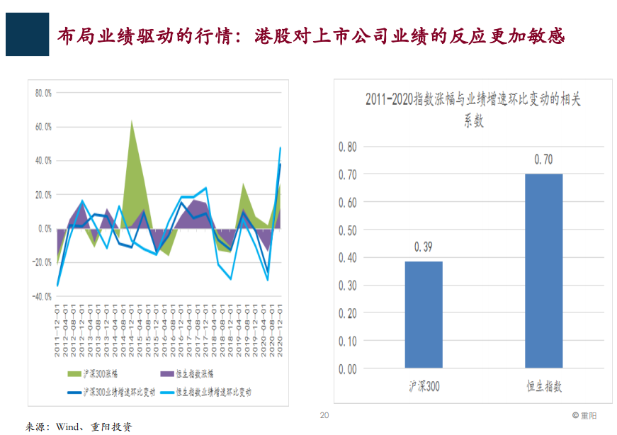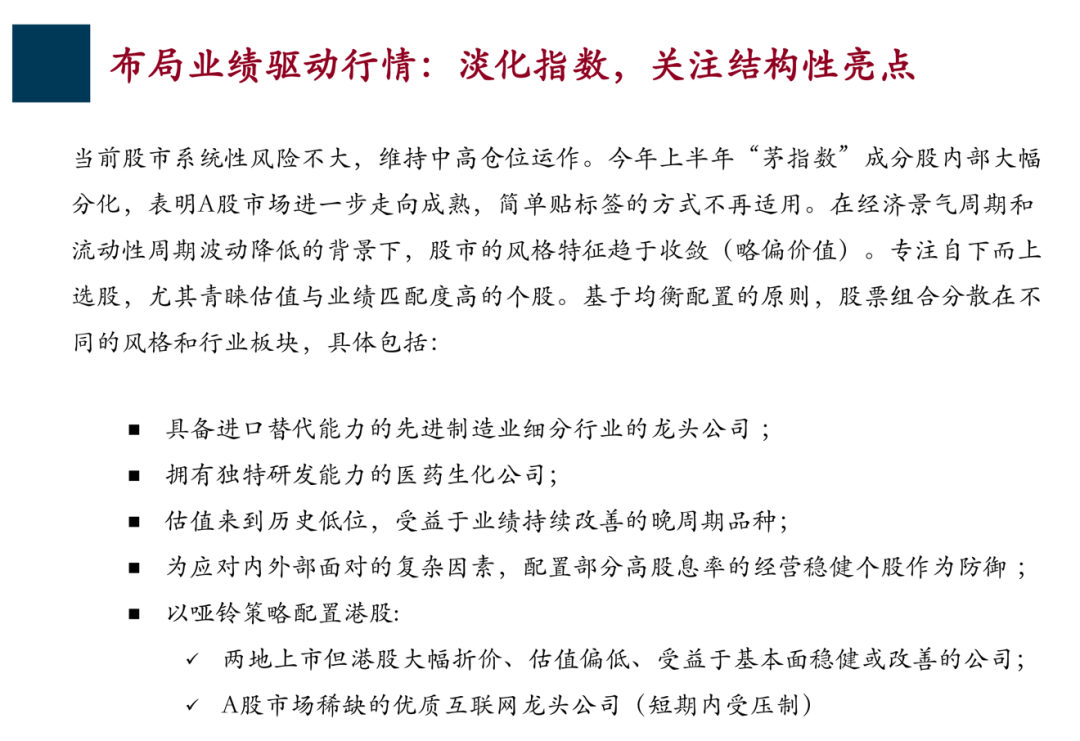 总结一下,我们认为当前股票市场系统性风险不大,前面谈到了全球的基本面、中国经济的基本面、中国股票市场的估值状况,以及相对投资价值,所以当前股票市场系统性风险不大。 那么我们的决策是什么呢?我们现在维持一个比较高的仓位,笼统说是中高仓位。 所以现在我们认为股票市场系统性风险不大,我们维持在中高仓位,这是第一点。 第二点,今年上半年各种茅指数的成分股内部已经也出现了大幅分化,说明A股市场已经进一步走向成熟了。 所以考虑到未来经济和流动性周期的收敛,实际上股票市场的风格也会进一步收敛,所以简单贴标签的方式就不再适用了,不能说我就投成长股,投周期股或者是防御性的股票,因为我们在经济景气和流动性景气、波动性降低的背景下,股票市场的风格在收敛。 但是收敛同时我们还想强调一点,考虑到流动性状况,我们认为总体收敛的背后还是更偏价值一点,因为流动性收缩,不利于整个估值扩张。 专注于自下而上的选股 我们主要在这3个领域进行布局 所以我们在这种情况下更加专注自下而上选股,尤其是要青睐估值和业绩匹配的个股,在这方面简单的说,我们可以适当淡化对宏观的关注,因为宏观上面波澜不惊,周期性特征降低收敛。 所以目前来讲,我们是一个均衡配置的原则,我们的组合现在在风格和行业板块上是相对不集中的,是分散的。 由于合规的关系,我不能涉及具体个股,总的来说我们在以下这几方面布局: 第一,具备进口替代能力的先进制造业细分行业的龙头公司,这方面就是对应我们前面谈到的A股市场的长期机遇,中国制造业的完整产业链,尤其强调布局具有进口替代能力的先进制造业细分行业的龙头公司。 第二,布局具有独特研发能力的医药生化公司,这里面既有医药公司,也有属于医药类的精细化工类企业,这是第二个布局的重点。 第三,布局重点是估值来到历史低位,受益于业绩持续改善的晚周期的品种,前面我们讲到了周期实际上已经到了下半场,下半场早周期的品种已经开始调整了,但是一些晚周期的品种还是有机会的。 尤其是股指来到历史低位,业绩持续改善的品种,这里面包括一些采掘行业。为了应对外部的一些复杂因素,我们还配置了一些具有高股息率的经营比较稳健的个股作为一种防御,这是一种均衡配置的原则。 大家知道我们重阳投资的理念是“价值投资、绝对收益”,绝对收益是我们的目标,获取绝对收益一定是均衡配置,既具有进攻性的组合品种,也有防御尾部风险的品种,也就是以高股息率经营稳健的个股作为防御。 关于港股,我们提出了哑铃策略; 港股上市公司对业绩的反应比A股强 再补充一点,关于港股,我们前面提到了港股的估值优势非常突出,我们提出哑铃策略参与港股。 什么是哑铃策略呢? 就是一方面在两地上市,但港股有大幅折价的标的,比如说刚才讲到的H股现在折价率虽然不是历史最高,但也是在历史较高的位置。 布局H股中低估值的,折价率高的,又是顺周期实际上业绩在改善的品种,这是一方面,是哑铃策略的一头。 哑铃策略的另一头是什么? 就是A股市场稀缺的优质的互联网龙头公司,这类公司我一说大家都知道,短期内是受到一些压制,比如说反垄断政策等等。 但是在我们看来,这些公司仍然是非常好的公司,行业发展空间仍然很大,实际上短期的政策压制构成了影响市场的一朵乌云。 但是实际上如果这些政策得到贯彻落实,是有利于这些龙头公司的长期发展的,这是我们的看法,这方面我们也是重点关注的。 港股除了刚才的哑铃策略,我还特别补充一点,也扣一下我们今天的主题,我们强调是业绩驱动的行情。 实际上如果认同我们关于业绩驱动行情这样一个判断,实际上港股上市公司对业绩的反应是更加敏感的。 如果是一个业绩驱动的行情,从历史上看,当出现业绩驱动行情的时候,港股的表现是可圈可点的,是不逊于A股的甚至是强于A股的,这个图中给大家呈现的数据就能看出来。