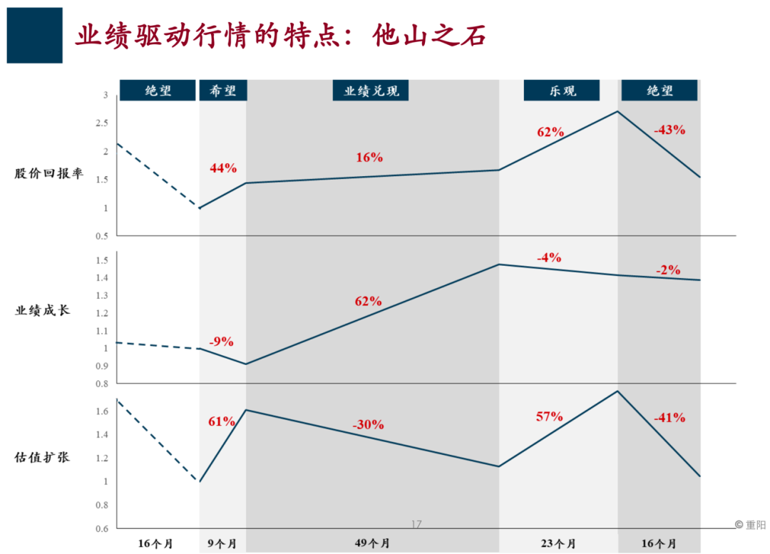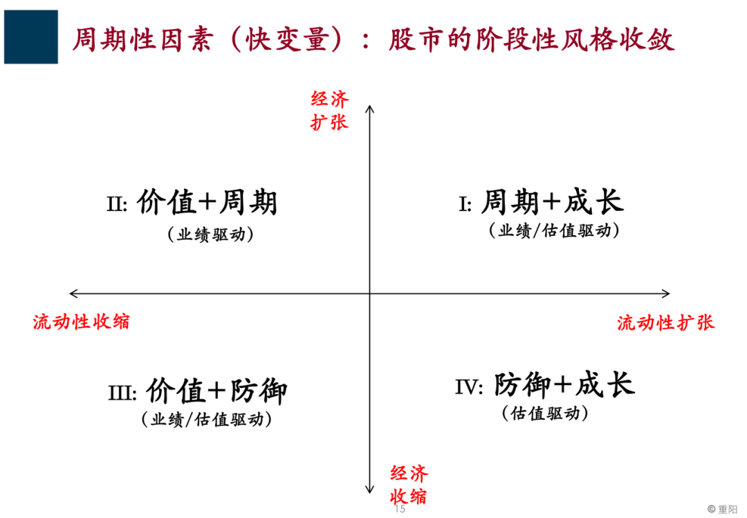 自上而下的周期性因素是影响股票市场的快变量 从今年上半年的股票市场表现也能看出来,影响股票市场表现既有自下而上的上市公司的因素、行业的因素,更重要的是,也有自上而下的周期性因素,这些因素是影响股票市场的快变量,这些因素很大程度上能够帮我们理解股票市场风格的剧烈变化。 这里强调一点,就是前瞻性股票市场的风格将会收敛,正是由于自上而下的宏观周期性因素对股票市场风格影响的收敛,实际上反而凸显了影响股票市场的另外一个非周期性因素,我们称之为结构性的慢变量因素,慢慢的它的作用才会彰显出来,就是我们强调的股票市场的长期的一些机遇,这里我们讲到了中国的一些大的优势和红利,比如中国制造业的产业链优势,统一的巨大消费市场,以及中国在数字经济方面的全球的领先,还有一些红利因素,比如工程师红利和对外开放红利。 我们之所以强调这些因素,是因为在影响市场因素的此消彼长的过程中,前瞻性的看,宏观周期性的快变量因素的影响力在逐渐减弱,相反长期结构性的慢变量因素慢慢变得更重要了,所以这是我们我们特别想强调的。 关于这一点,重阳在做分析的时候一定是自上而下和自下而上结合的,既要看长期结构性的因素,像产业的变迁、消费结构的变迁、人口结构等红利因素,也要看一些宏观周期性因素,两个结合在一起,才能对市场、对分析有一个全面的认识。 经过这样的分析,我们就得出了下面要得出的重要结论,也是我今天分享的主题:业绩驱动的行情。 我们认为流动性将不再宽松,驱动 市场最重要的因素就变成了业绩 我们强调未来市场的主基调是一个业绩驱动,业绩驱动对应的是估值扩张,过去2019年、2020年以及今年上半年市场极致的变化,像风格的轮动以及极致的分化,实际上驱动主要因素是估值的扩张和收缩。 市场短期的一些比较抓人眼球,甚至比较过瘾的一些变化,都是由估值的扩张和收缩引起的。 而估指扩张、收缩很重要的环境是流动性的宽松,前瞻性看,我们认为流动性不再宽松,驱动市场最重要的因素就变成了业绩。 业绩驱动的行情是我们反复强调的,业绩驱动的行情到底是有什么特征呢? 我简单描述一下,这对我们理解未来市场表现以及如何表现,包括如何理解未来市场的收益状况都是有帮助的。 希望阶段股票上涨最快,我们认为A股将进入业绩兑现的阶段 图中给大家展示的数据是真实的股票市场数据,但是它不是中国的数据,是美国的数据,因为美国数据比较全,这些数据是从美国过去近百年股票市场数据提炼出的规律,整个股票市场在周而复始的上涨过程中,表现出明显的阶段性特点。