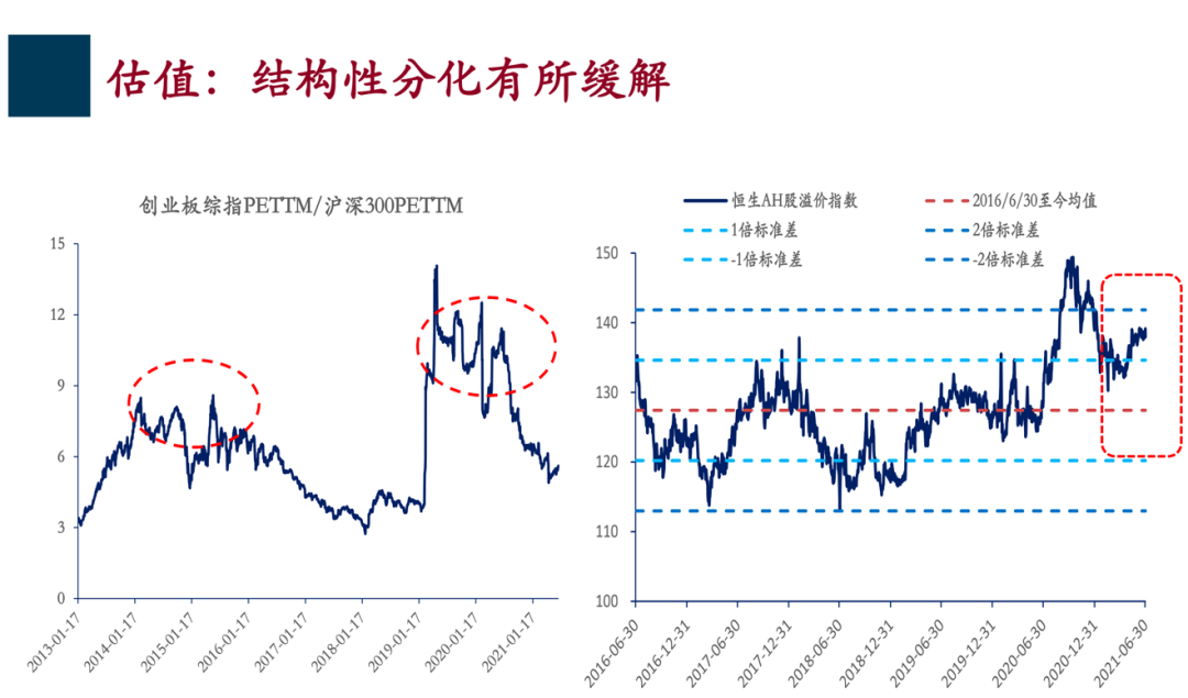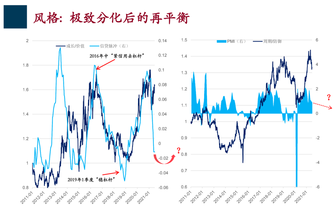 什么是周期股? 就跟经济密切相关的,比如有色金属、建筑、建材、钢铁甚至一些可选消费等等,防御股就是必选消费,比如像医药这种跟经济关系不大的行业。 他们股价表现有这样的特征,背后的原因是经济景气,图中呈现的PMI(采购经理人指数),当采购经理人指数表现强劲的时候,周期股就会表现好,反之防御股就会表现好,它的波动很有意思,它会在股票市场呈现出机会和风险。 比如从2019年到2020年上半年,防御股表现比较好,比如医药、避险消费,像一些牛奶、佐料、调味品等等,但是从去年下半年到前段时间,周期股表现的一直很好。 人人都讲顺周期,但是大家有没有注意到,周期股和防御股之间的相对表现已经出现了拐点。 这个拐点跟经济景气匹配,而经济景气就是采购经理人指数已经逐渐往下走了。 下面一个问题是我在图中标注的红色箭头和问号,问题是采购经理人指数会不会继续往下走?这个是大家特别关注的。 如果继续往下走,就意味着周期股的行情基本上告一段落,至少它相对防御股的表现会告一段落,这是一层意义上的分化。 流动性拐点出现在2020年年底,后续环境将有利益价值股 另外一个分化是成长股和价值股的分化,刚刚左边的图是成长股和价值股股价的相对表现,历史上出现过剧烈波动,同时在2019年二季度开始一直到今年的一季度,成长股一直跑赢价值股。 什么是成长股?顾名思义就是高成长同时高估值。 什么是价值股?通常也是成长性一般,但是估值也比较低的。 这种分化跟流动性状况有关,这里流动性状况用的是所谓的信贷脉冲,信贷脉冲就是新增社会融资增速的变化,新增社融的变化可以简单把它理解成经济流动性状况。 流动性状况对股票市场中成长和价值风格之间的相对表现,具有很强的解释力,当流动性状况好的时候,成长股就表现好,流动性状况弱的时候,价值股就表现好,而且具有巨大波动。 今年3月份以来,市场的调整反映出了在一定程度上流动性拐点已经出现,而流动性拐点是在去年年底出现的。 按照这个规律,后续的环境应该是一个有利于价值股的环境,因为信贷脉冲实际上是往下走的,而且很明显。 下一个流动性拐点或将在今年年底 或明年年初,风格分化将会收敛 现在大家关心的问题是下一个流动性拐点何时出现,我们的判断是,无论是经济的景气还是流动性的景气,波动性都会降低,因为从2019年到2020年,再到2021年上半年,实际上经济周期和流动性周期的波动都比较剧烈, 原因是2019年从去杠杆到稳杠杆,又到2020年初疫情的冲击,疫情之后的修复等等,经济波动巨大,对应的流动性波动也比较大,现在随着疫情后经济的修复等等,两个周期的波动性都会收敛。 往后看,一个很重要的判断,就是无论是PMI(采购经理人指数)还是信贷脉冲代表的流动性的指标,在今年底或明年初有可能都会出现拐点, 但这个拐点不会像之前那么急,也不会太剧烈。 所以这两个指标都会收敛,这意味着影响股票市场风格的因素,像过去两年以来大家经常见到的极致化的风格分化,恐怕在未来很难见到了, 因为影响风格的一些宏观因素不像以前剧烈波动了,因此反映在股票市场上就不会那么极致。 回到我刚才讲的,我们认为未来一段时间股票市场的风格将会收敛,这一点是跟去年4月份我跟大家分享的有一些变化。 如果从前瞻性角度看的话,影响股票市场最重要两个周期,经济周期和流动性周期,波动不像过去那么大了,反映在股票市场上,就意味着股票市场的风格将不会像以前那样鲜明,也不会出现极致的分化了。 所以不要把过去的经验简单的延伸到未来,因为未来会变化。 整体风格我们倾向于价值类 在这样的基本判断之后,如果从四维度的框架来看,我们还是倾向于未来股票市场在整体风格均衡的基础上还是更偏价值一点。 我们认为总体上还是偏左边2个象限(第2象限和和第4象限),所以无论是价值周期和价值防御这类股票,我们还是要特别重点关注的。