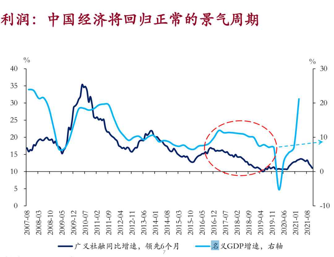 经济景气度和业绩周期进入正常周期,马上要公布的中报中,上市公司的业绩整体很好 首先关于上市公司的业绩,上市公司业绩是直接跟宏观经济相关的,这里就用名 义GDP数据来呈现,一个很重要的判断就是, 无论是中国上市公司还是海外上市公司的业绩表现,都会回归到一个正常的景气周期。 特别强调正常的景气周期,是想区分什么是不正常的,不正常的景气周期是疫情冲击时和疫情冲击之后的V形反弹,这显然是不正常的。 另外一个不正常是图中画的红色圆圈,这个部分是中国经济的增长和中国社会融资增速的增长,这个轨迹是从2016年下半年到2019年上半年,将近三年时间的表现。