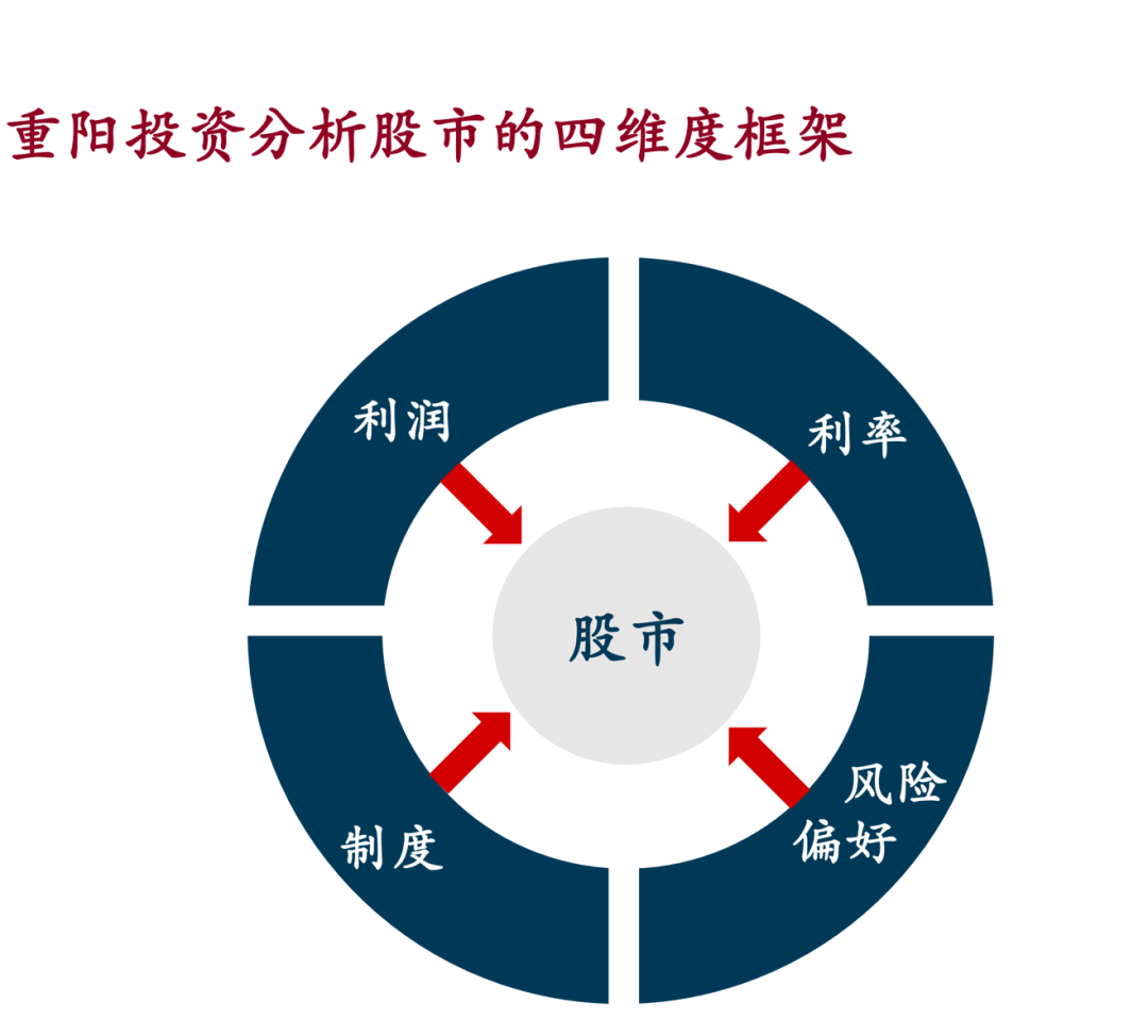这个过程中出现了明显的连续三年的经济下行,而经济下行的背后,代表了信用周期的社会融资增速的下行,这种状态是不正常的。 为什么不正常呢? 因为在这三年,中国经历了一个紧缩的政策周期,就是大家熟知的去杠杆、紧信用的政策周期,由于政策、信用的收紧,带动了经济的收紧,从而表现在上市公司业绩的收紧。 所以这是一个持续三年的下行周期,这个周期早在2019年二季度就结束了,本来经济和上市公司业绩的周期马上就要进入正常周期,但是被疫情打断了。 现在随着疫情的影响逐渐减弱,再次回到了正常的景气周期。 我们二季度的数据不久就会公布,今年下半年经济增速都会放缓,因为一季度经济增速高达18%,放缓是因为基数和疫情修复的原因,但是它并不代表整个经济增长水平发生了明显的变化,因为它只是正常的回归。 同样上市公司业绩也是如此,不久前我们公布的年报和一季报,上市公司的业绩整体表现相当不错,以及马上要开始公布的中报,上市公司业绩的表现也很好。 其中有疫情之后修复的因素,但实际上更重要的是整个经济景气和上市公司业绩周期进入了一个正常周期,这一点很关键,这是关于盈利方面。 理财产品的收益率和无风险利率仍处在下行通道,下行空间比较大 另外一个因素就是利率,利率这个因素很重要,无风险利率很大程度上决定了股票市场的估值中枢,估值影响股票和所有风险资产的估值中枢,很显然无风险利率仍然处在一个下行通道,上一季度跟大家分享的时候也提到这一点。 多了一季度的数据,这方面的证据就更加清晰了,因为无论是理财产品的收益率,还是十年期国债收益率,实际上仍然处在一个下行通道,尤其是最近10年期国债收益率经过反弹之后,又开始逐渐缓慢下行,所以这个过程没有变。 中国的规律性跟其他主要经济体的规律性是一致的,这个没有变,对风险资产的积极影响还会持续发酵,因为利率水平仍然偏高,下行空间还是比较大,这是第二点。 资管新规、打破刚性兑付、房住不炒等制度 正在改变居民资产配置结构不合理的现状 第三点就是中国资本市场的制度环境,制度环境本身就对股票市场的供需方都有影响。 “供需”中的“需”指的是从需求方面产生的影响,是由于制度变化产生了对风险资产,尤其是股票资产的持续的需求, 哪些制度发生了变化? 资管新规的落地、打破刚性兑付,以及房住不炒的政策,结果就会导致居民资产配置发生重大变化,这个重大变化简单通俗的说就是从银行存款变成股票,从理财产品变成股票,从“砖头”变成股票,这个变化本身触发因素是资管新规和房住不炒的政策。 实际上背后有更深层次的原因,中国老百姓的资产配置结构本身就不合理,横向和其他国家比较的话,我们的存款比例太高,固定收益的理财产品比例太高,房地产比重太高,而像股票类的净值化产品的比重太低。 这个结构性由来已久,但是在资管新规落地的催化下,终于触发了居民资产配置行为的变化,这个方面就构成了对风险资产持续的需求。 所以从2019年、2020年以及今年以来,别看市场有涨有跌,但是投资人对股票市场、基金的需求一直是比较旺盛的,毫无疑问是跟制度的变化有关的,这是一方面,制度变化影响了股票市场的需求。 注册制的改变带来了更丰富的投资机会 另一个制度变化影响了股票市场的供给,这就是所谓的注册制,新股发行的注册制。 简单的说,在注册制度之下,由于上市标准更灵活,使一些优秀的成长性比较快的公司可以尽快上市,成为上市公司之后它会继续创造价值,给二级市场的投资者带来更大的可以分享价值的空间。 归结一点就是在注册制之下,带来了更丰富的结构性的投资机会,一方面有资管新规的落地政策,一方面有注册制的全面的推开,使得资本市场空前的活跃,二级市场的投资机会也越来越丰富。 目前投资者的风险偏好没有明显恶化 最后一个因素就是投资者风险偏好,投资者风险偏好简单的说,就是投资者到底有没有意愿、有没有兴趣或者有没有心气参与股票市场。 关于这一点,我们的判断是目前投资者的风险偏好没有明显恶化,尽管市场有波动,我们投资有自己的模型,其中一个很重要的指标是 A股市场投资人的情绪指标,这里我们用了一些标准化的方法处理,这个指标是基于投资者行为、投资者风险偏好相关的指标合成出来的。 这个指标显示A股市场当前的情绪是高于历史均值的,没有特别亢奋,但是绝对不悲观。 综上所述,从重阳的四要素框架分析下来,得出一个基本结论,股票市场的基本面是比较健康的,再结合我一开始提到的全球经济后疫情时代的修复,这样我们对股票市场就有一个大概的认知了,总体上股票市场没有大的风险,这是一个基本的判断。 当然做投资只做这种大而化之的基本判断是不够的,一方面还需要看基本面,另一方面要看股票市场自身有多大成长以及是否充分反映了这些基本因素。 股票市场的估值相对合理,正处在历史的均值附近 理论上来讲,这时候就要看估值了。 如果看估值的话,几个宽基指数的估值水平从历史分位数上来看应该都比较高,都超过了80%,在历史上来看估值的绝对水平还是挺高的。 但是只看这个是片面的,正如我前面谈到的无风险利率一样,实际上无风险利率很大程度上能够影响估值中枢,很显然目前无风险利率处在历史的低点, 所以结