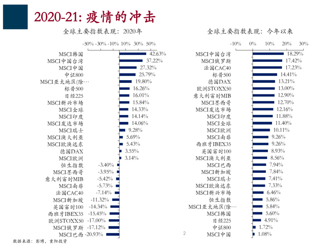 | 全球经济在短期内增长动能的峰值已过,10年期国债收益率趋势向下 今天我准备的题目是“积极布局业绩驱动行情”,大家从题目中也能看出我今天要讲的主题,我会用重阳一贯比较严谨、偏学院派的方式和框架来跟大家讲述。 首先在分析当前A股市场投资机会和策略之前,先介绍一下大的背景: 第一:我们回顾了过去一年股票市场的表现,发现一个非常明显的规律,规律就是影响股票市场表现的最重要的基本面因素是疫情,下面的图中呈现了全球所有主要股市的表现,左边是2020年的表现,右边是今年以来的表现。
