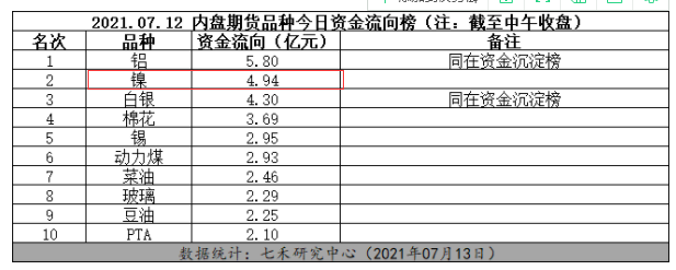 | 七禾数据 今日,沪锡续创主力合约历史纪录新高,截至今日收盘,沪镍主力合约上涨1.01%,盘中最高到141110,创四个月来新高。 今日,镍资金流入4.94亿元