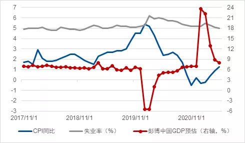 图11 一些国家的央行总资产/ GDP (%) 数据来源: 彭博、凯丰投资 高货币发行量意味着现有的高资产价格(美国),而偏紧的货币意味着未来的空间(中国)。美国的货币发行将更高的比例留存在了美国,推动了资产价格的上涨。市场预期8月左右美联储会释放缩减每月购债1200亿美元的预期,然后明年初正式开始实施,逐渐结束货币扩张。 美元紧缩通常对全球产生负面影响,但过去每轮紧缩均导致新兴市场的危机情况在本轮大概率不会发生,因为过去几年发达国家货币超发,存量更多地在本地沉淀,美元收紧导致其资产价格的调整更为剧烈,而不是在货币空间更大的中国。 事实上,中国宣布降准后人民币的上涨验证了这个预期,因为降准在推动金融资产价格上涨的同时,还会吸引资金流入,支持人民币上涨。 经济(Economy):Goldilocks 拜登政府的大幅刺激加码,导致今年全球的增速要比初始预期好。 IMF(国际货币基金组织)在4月将2021全球增速预计从5.2%上调到6%,主要是将美国从3.2%上调到6.4%。我们年初时低估了美国政府实行牺牲通胀以强化就业的“高压经济”政策的可能性,但对中国的谨慎判断证明是正确的。