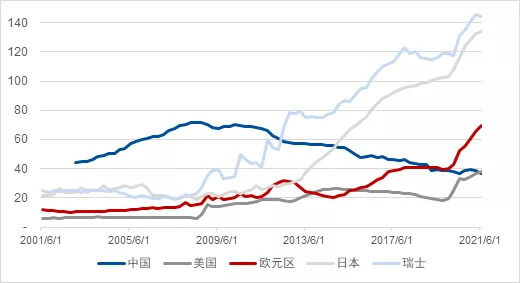 图10 10年国债利率水平与变化显示中国国债的价值最高 数据来源: 彭博、凯丰投资 在风险平配中,显而易见的风险是通胀。当下中国通胀的潜在来源还是商品。从宏观角度分析,我们本来就看好商品,在经历这波回调后,有色的机会或将再次出现,所以多头的商品自然对冲了部分通胀风险。 通胀风险可能对欧美的零息债券带来更大的威胁,所以可以适当做空美债、欧债。空头配置发达国家债券本身阿尔法,同时还可以完成对冲通胀的任务。 股票结构方面,我们依然长期看好非碳能源、高端制造中的半导体材料以及国产替代。 对于美股,我们总体倾向于看空。我们在去年底预期今年下半年会展现的风险,比如通胀带来的货币政策收紧以及拜登为财政支出所必要的加税都在临近,可能都会带来负面压力。 资金(Capital):去美元化的进行时 前面谈到美元在全球外汇储备占比的下降首先是全球资金再配置的结果,其深层原因在于央行的货币发行。 2015年前,人民银行总资产与GDP的比值遥遥领先发达国家,给人们留下央行乱发钞票的深刻印象。但自2008年金融危机以来,中国在宏观审慎管理上不断发力,总资产与GDP的比值指标不断下行,自2015年起低于日本,自2020年起低于欧元区,而今年二季度终于完成了历史性“飞跃”,低于美国。