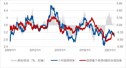 图9 伦敦铜与布伦特及铁矿石的现货比价关系 数据来源: 彭博、凯丰投资 原油与铁矿这两类碳相关的商品跑赢铜的原因不尽相同。原油价格的上涨得益于去年油价的低基数以及美国全球影响力的衰落。 这种衰落一方面体现在拜登无法说服OPEC增产。在原油价格突破每桶70美元后,白宫新闻秘书公开表示虽然在继续与沙特及其他产油国沟通,但是总统对汽油价格的掌控能力有限。 美国全球影响力的衰落另一方面体现在其与伊朗的谈判也无法达成协议来释放伊朗产能。俄罗斯更是于五月份公开挑战美国在原油定价方面的霸权,将其外汇储备中的美元权重调整为零。 黑色方面,受碳中和政策影响,黑色需求旺盛,政策驱动的供给成为其核心矛盾。总体上,由于黑色的碳属性,政府倾向于限制产出,支撑了黑色价格的上涨。 于是在今年商品普涨背景下,我们看到了长期主题宏观面最好的铜反倒表现得相对最弱。这里还存在资金角度的影响因素。 通常美国宏观资金做宏观会着重以美国经济消耗量最大的油气为标的,毕竟美国铜的长期消费在过去很多年没有什么大的增长,而中国的资金倾向于黑色。从持仓数据来看,我们也发现海外原油与国内黑色增加的同时,铜却成为一个“爷爷不疼姥姥不爱”的角色,持仓相对于去年底反而下降。美铜总持仓下降约20%,沪铜则下降约5%。 2 . 股债策略:风险平配,通胀对冲 很多人都知道凯丰的投资理念“极精微,致广大”,它出自《中庸》的“致广大而尽精微”。其实《中庸》后面还有一句叫“极高明而道中庸”,而“中庸”并非“平庸”。很多时候,中庸配置是好的配置,由于债券票息、股票ROE与红利的存在,中庸配置通常要优于现金。现在的市场可能就处在这样一个有趣的时间点上。 根据历史来看,债券的吸引力取决于央行的货币政策、股票的市盈率以及海外债券利率的对比。如果我们做一个简单的回归模型,根据沪深300的盈利率与十年期美债利率来估算中国十年期国债利率的公允价值,我们会发现中国十年期国债的利率水平已经非常合理。 股票相对于债券的合理估值意味着没必要过于偏离中性配置。通常好的组合追求的是高夏普比率,而风险平配的优势就是利用“股债跷跷板”来提高夏普比率。