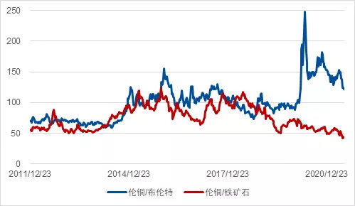 图8 德国制造业价格领先通胀 数据来源: 彭博、凯丰投资 第三个风险可以说是正面的,中美之间的各种矛盾将在一定程度上有所化解,美国商务部与贸易谈判代表开始释放与中国重启贸易谈判的信号。由于美国通胀已经大幅攀升,谈判中不可避免的议题之一就是美国对中国商品加征关税。可能存在的正面风险在于美国可能全部或者部分取消这些关税。 谈到风险,今年上半年中国的信用风险一直没有释放,这可能与建党100周年庆典有一定关系。这一风险在下半年释放的概率或将大幅提升,但我们一直判断不需要担忧中国的系统性风险,而是做好准备,待信用风险暴露时抄底优秀公司的信用债券。 资产(Asset):中国平衡配置加风险对冲 投资者进入市场时,通常最为关注下个季度进行何种投资操作,包括买哪类资产、哪个板块以及哪只股票。 平配的答案似乎不太令人满意,但根据现有的宏观主题与周期位置判断,这可能反倒是今年下半年宏观基金不错的选择,未来更大的机会可能来自于找寻资产内部的结构性机会以及适当的交易择时。 1 . 商品:有色的基本面最坚实 历史上,美国经济表现主要看居民相关的油,而中国经济表现主要看基建与房地产相关的钢。 从二者价格上涨幅度上分析,今年中美经济表现都不错,与增长数据相一致。如果对数据仔细拆分,我们会发现原油与铁矿不仅仅是在绝对水平上涨得较多,还在今年以来远远跑赢最具长期基本面与宏观面因素支撑的铜。