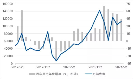 图5 稳定国际美元购买力平价计算的人均GDP 数据来源: 彭博、凯丰投资 第二大转换的直接含义会利多商品。这一点在今年上半年已经充分演绎,美国重新开放也可以看作是虚拟需求(隔离上网“软消费”)到商品需求(户外开车出行“硬消费”)的转换过程,这一消费转换利多原油。 但另一方面,随着油价接近80美元每桶,我们也需要考虑更长期的趋势,就是美国重回巴黎协议增加了全球对环境变化以及碳中和的关注。站在这个角度,衍生了转换二的次生主题,即油(碳)电(非碳)经济转换。 仅从电动车销量来看,这个转换正在如火如荼地进行中。中国电动车今年前五个月的销量相对2019年而言年化复合增速超过50%,助推了整个非碳相关板块的上涨。