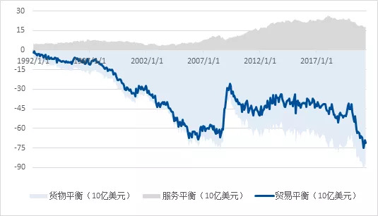 图3 美国国会预算办公室预测未来十年的联邦赤字 数据来源: 美国国会预算办公室、凯丰投资 历史上财政赤字膨胀时,除非货币政策能像80年代初一样维持在很高的实际利率,否则美元将更易流出,导致美元随着赤字贬值。面临巨幅的赤字,除非美联储加息速度迅速提高,使得利率水平超过通胀,否则资金流出会是大概率事件。 另一方面,贸易赤字。2008年金融危机之前,美国的贸易赤字就在不断恶化。在金融危机后,美国储蓄率的提升在一定程度上减小了货物贸易逆差,同时服务顺差大幅提升,对美元起到了相当大的支撑作用。但在本轮疫情冲击中,美国货物与服务贸易平衡的双恶化肉眼可见。 货物逆差主要是因为美国本轮的财政刺激稳定了需求,但同时疫情对供给端的影响导致货物只能依赖进口,特别是中国与亚洲其他疫情控制得比较好的国家,比如越南。服务贸易项目下的恶化更为复杂。首先,月度80亿美元的下降数额相当巨大。其次,单是中国的下降数额就在20到30亿美元之间。 随着疫情的好转,虽然我们可以预期美国与其他国家之间的贸易顺差会有所修复,但美国与中国的贸易顺差修复却会极为有限。无论是留学服务、旅游服务还是更高端的软件、金融、法律服务,脱钩现象都将更为明显。