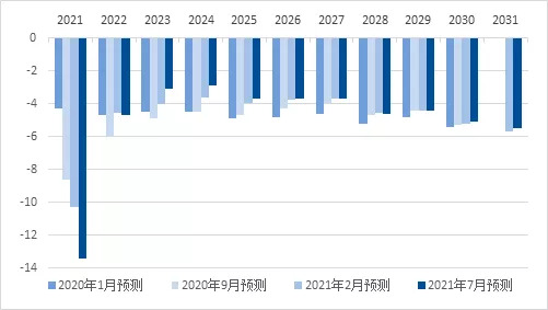 图2 自2014年底全球外汇储备各币种占比变化(百分点) 数据来源: 彭博、IMF凯丰投资 美元在全球外汇储备中的占比在2014年底见顶后已从高位下滑约7个百分点。在这个过程中人民币受益最大,上升了2.5个百分点,新兴市场为主的未分配部分占比也上升了0.3个百分点。在过去两个季度,受益最大的也是人民币。 展望未来,美国的“双赤字”将加剧这一转移。 一方面,财政赤字。通常来说,发达国家的财政赤字如果伴随合理的货币政策,那么就会增强货币的吸引力。但在本轮危机中,美国货币政策金融压抑的同时(零利率量化宽松对应5%的CPI),财政持续扩张,美国执行了并未明说的现代货币理论(MMT)。 以2021年为例,去年9月预测今年赤字为8.6%,今年2月预测为10.3%,而最近7月预测的赤字规模已经调至13.4%,与美国去年疫情年份14.9%的赤字率相差无几。以上的演化代表了美国自2008年金融危机以来的模式,即当下刺激、恶化当期财政,同时上修未来、预期好转,但未来到期时再次恶化,周而复始。