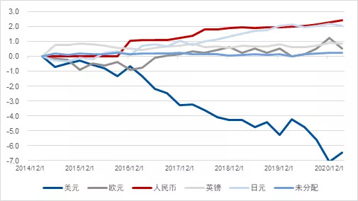 图1 2021年上半年股债商品的表现 数据来源: 彭博、万得、凯丰投资 主题(Themes):三大格局转换小幅调整 TRACE追踪框架以主题为首,自2020年以来我们长期跟踪三个主题:发达到新兴的转换、虚拟到商品的转换、被动配置到主动策略的转换。展望下半年,三大主题都有一定的修正。 转换一. 美国“双赤字”助推发达到新兴的转换 如果要找一个非常宏观的指标,那么全球外汇储备就是一个非常重要的代表。资产配置不仅仅依赖于全球经济格局和贸易格局这两个重要的宏观因素,还依赖于全球政治格局。“政治是最大的宏观”,依据美国对中国的重视程度以及最近中国在联合国获得远超美国的支持,我们清晰地看到了发达向新兴的转换这一趋势。