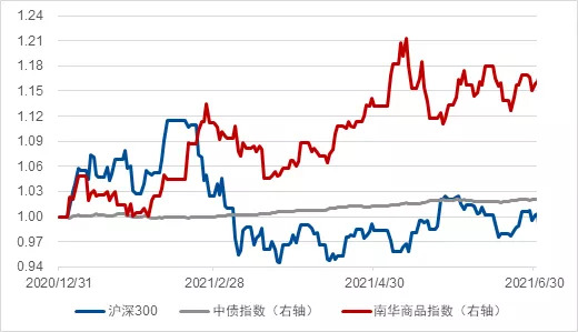 | 2021年上半年策略回顾:商品驱动 在2020年底展望2021年市场时,我们提到“未来一年在国内各品种中,我们预期商品的机会最大,利率债机会也很大,二者形成有效的互补。股票端我们延续看多港股的看法,结构上看多新能源、银行与周期。” 站在半年线上回顾市场,商品在今年延续了去年下半年的态势,相对于股票表现更强。南华商品指数在过去六个月的回报达16%,遥遥领先于其他两类资产。 债券保持稳健,资金虽在一月中存在短暂扰动,但后续并未持续。中债指数上半年给出了2%的回报,表现中规中矩。 一月中的货币扰动出人意料,股票的喧嚣可能是个诱因。年初过高的预期与过快的上涨所导致的春季躁动无法持续,百年庆典行情也并未发生,沪深300指数在上半年回报几近为零,而恒生指数却从低位反弹了7.4%(总回报)。 从结构上而言,A股的周期、新能源与银行等板块都有不错的正收益,但H股的周期、新能源与银行只跑了个平均。