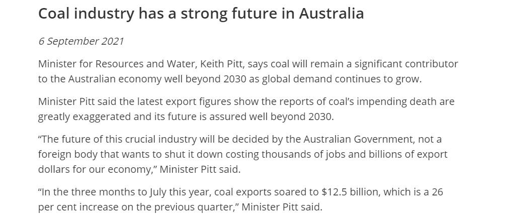 (来源:政府网站) Pitt同时提及,在今年五至七月澳大利亚的煤炭出口额增长26%至125亿澳元(约合93亿美元),同时主要经济体从新冠封锁措施中恢复也带动煤炭价格走高。 目前联合国的立场是呼吁OECD国家在2030年退出煤炭产业,但很显然澳大利亚对此并不认同。该国总理莫里森曾经表示澳大利亚正处于零碳排放的路径上,但没有给出具体的时间表。不过莫里森也曾表示将会在11月的联合国气候变化大会上给出最新的2030减排目标。 责任编辑:七禾编辑 |