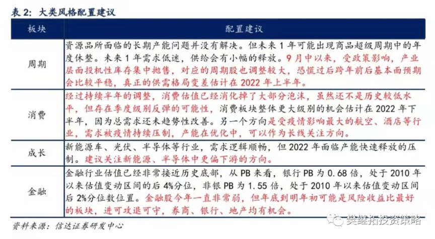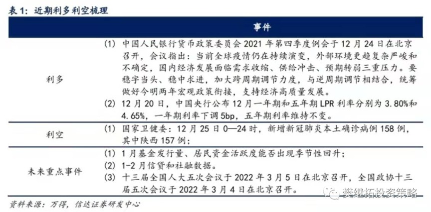 行业配置建议:近期市场选股逻辑仍然沿着估值修复展开,有两条主线:一是消费板块的技术性反弹,除了近1个季度持续反弹的食品饮料、农林牧渔之外,受疫情压制时间较长,前期调整幅度较大的旅游、酒店,以及商贸零售在12月开始轮流表现。二是稳增长相关板块的估值修复,房地产产业链(地产、建材等)也有表现。由于现在是业绩真空期、我们对2022年全年的业绩展望偏谨慎,我们认为估值修复将会是跨年前后最核心的选股逻辑。配置建议:(1)军工、酒店、航空等行业供需周期独立,2022年可以全年关注。(2)金融地产一般在经济下行的中后段进可攻退可守,稳增长力度未来半年会逐渐加强,可以超配半年;(3)食品饮料、家电、计算机、传媒等今年表现较差的板块,处在季度性反弹的过程中。
