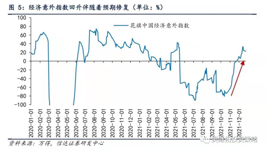经济预期的修复,背后有两个原因。首先是12月降准、中央经济工作会议等,让投资者对2022年的政策基调有了较大的乐观修正,这一影响预计还将持续到明年初。其次,如果从经济指标超预期的情况来看,宏观经济指标已经有Q2-Q3不断低预期的状态,改变为小幅超预期。