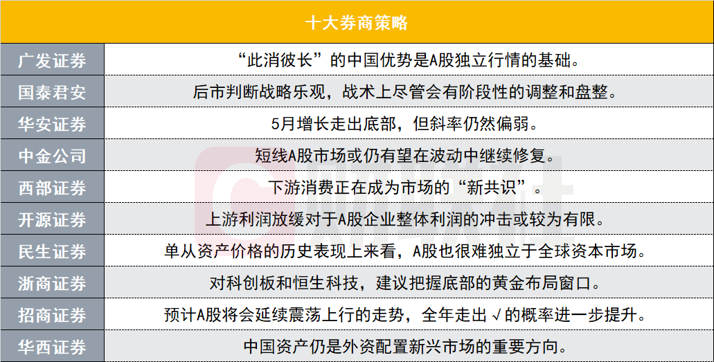 在全球市场疲软的背景下,本周A股走出“独立行情”。对于本轮反弹的持续性与可靠性,各大券商有给出了怎样的判断?后市应该如何布局? 广发证券:“此消彼长”独立行情的三条主线 A股“此消彼长”的“独立行情”源于“美联储坚决紧,国内信用底已过”,5月以来中国决策层致力于恢复经济活力。5月中旬至今北上资金持续流入,对推动本周A股的“独立行情”功不可没。当前A股主要由国内因素主导,但海外因素仍不可忽视。 “此消彼长”的中国优势是A股独立行情的基础。(1)此消:“逆全球化”供给收缩/20年疫情以来货币和财政政策过度刺激/“工资-通胀”螺旋,美国“滞胀”重现。俄乌冲突加速“逆全球化”,加剧美国“滞胀”压力。滞胀+紧缩导致美国经济衰退担忧。(2)彼长:中国积极拥抱全球化,稳健的货币和信用政策以及22年A股结构性“供给过剩”缓和通胀压力。宽信用“再加杠杆”/恢复经济活力政策,改善经济修复预期。中期来看,中国低碳新能源+5G场景革命抢占“工业4.0”时代先机。 A股“此消彼长”独立行情关注“复苏交易”中国资产的3条主线:(1)疫后修复:物流/制造/贸易/消费等领域的景气预期将结构性改善(汽车(含新能车)/半导体设备/光伏组件)。(2)再加杠杆:“稳增长”政策暖风频吹,重点关注行业压制性政策逐步转向宽松(互联网传媒/创新药/地产),以及民企信用环境改善、景气预期高位回升的新兴产业产能扩张(锂/电池化学品)。(3)通胀受益:新能源链的投资/生产/使用将会强化上游资源/材料行业“供需稳态”(煤炭/钾肥/养殖业)。 国泰君安:成长领旗,消费助攻 预期上修开空间,对后市保持乐观。本轮调整的经济底部与市场估值底部都已经明确,对可预期的风险已经充分的表达在1-4月的市场剧烈调整过程当中。随着国内经济政策和疫情防控政策向积极的方向推进,股票资产的风险补偿进入下降通道。 5月信用、生产、出口等多项数据均超预期,地产与消费同比降幅出现了收窄,投资者对经济企稳复苏的信心增强。而另一方面,宏观流动性的极度宽松叠加金融资产荒,市场的无风险利率下降,余额宝7天年化收益率从一季末的1.97%快速下降至1.67%,同期银行理财年化预期收益从3.59%快速下降至2.70%,增量资金入市以及股票买盘极强。后市判断战略乐观,战术上尽管会有阶段性的调整和盘整,我们认为经济预期上修,无风险利率下降,风险偏好底部回升的过程还未结束,积极布局股票资产。 1-4月由于投资者担忧经济存在系统性风险,开始厌恶风险,因此投资者更多的选择是把股票换成现金或者高业绩确定性的板块避险。5月上海疫情解封以来,随着经济预期的好转,宏观经济政策更为积极,投资者不再恐慌和厌恶风险,风险评价和风险偏好均出现了正向演进,个股活跃度显著上升,这是一个非常重要的变化,意味着业绩确定性将不再主导股票投资风格。相反的,在经济增长见底、经济预期上修,但实体经济恢复仍较慢的过程之中,受益于政策支持、需求边际改善,尤其是增量经济带来的需求改善弹性更大的成长板块将具有更好的盈利与股价弹性。加之股票市场流动性扩张,我们建议下一阶段更强调结构,积极布局业绩高增长的股票。 行业与投资主题:看好科技成长与消费复苏。经济预期上修,风险评价下降,风险偏好上升,选股重在盈利高增长。推荐:1)高景气成长板块:电动车/光伏/风电/军工/计算机信创/数字产业;2)困境反转:汽车零部件/白酒/生猪/酒店;3)港股科技龙头。此外,个股活跃度提升,重视投资主题:汽车智能化/充换电/新材料/虚拟现实/碳通胀/国企改革等。 华安证券:关注盈利修复弹性,围绕景气挖掘主线机会 当前市场面临内支撑、外收紧的环境:内部经济底部回升,盈利修复确定性增强,但需要关注盈利修复弹性;外部美联储6月加息75BP落地、美债快速上行,流动性收紧预期进一步增强。以上环境导致短期速涨的成长风格承压,A股能否持续逆势全球上涨的担忧升温,建议关注景气改善叠加补涨预期和景气有望反转的地产两大主线。 5月增长走出底部,但斜率仍然偏弱。5月份国民经济运行呈现恢复势头,与市场预期一致。但对于数据并不能过于乐观,经济复苏的斜率依然偏弱。消费端复苏仍受制于消费信心偏弱与偏高的失业率,投资端地产复苏已错过上半年最佳窗口期将继续拖累投资端改善。乐观预计Q2经济增速有望小幅为正,在1%左右。 外部急跌对风险偏好的抑制不可忽视,内部经济底部回升弹性仍需关注。近期美股急速下跌带来的风险偏好抑制不可忽视,显著反差的背后对A股而言仍然存在尚未计价的风险。本阶段市场对美联储紧缩强化的预期基本结束,美股短期内有望企稳反弹,后续继续重点关注7月10日美国CPI变化。国内最值得关注点在于经济复苏的弹性,预计7月中旬之前国内大的增量性政策仍需等待。 资金充裕得到证实,地方政府债券开启年度发行高峰期,微观流动性持续好转。当前地方政府债券周度发行已高达6000亿元,月底前距离36500的发行目标缺口压力减轻。内外压力下长、短期利率仍能维持低位,资金短期充裕由此得到证实,后续预计利率短端低位、长端缓升。北上资金持续积极流入,微观流动性延续好转。 中金公司:海外波动下A股韧性凸显 整体上看,我们认为年初至4月底中国市场调整幅度已经较大、估值处于相对低位,近期国内疫情