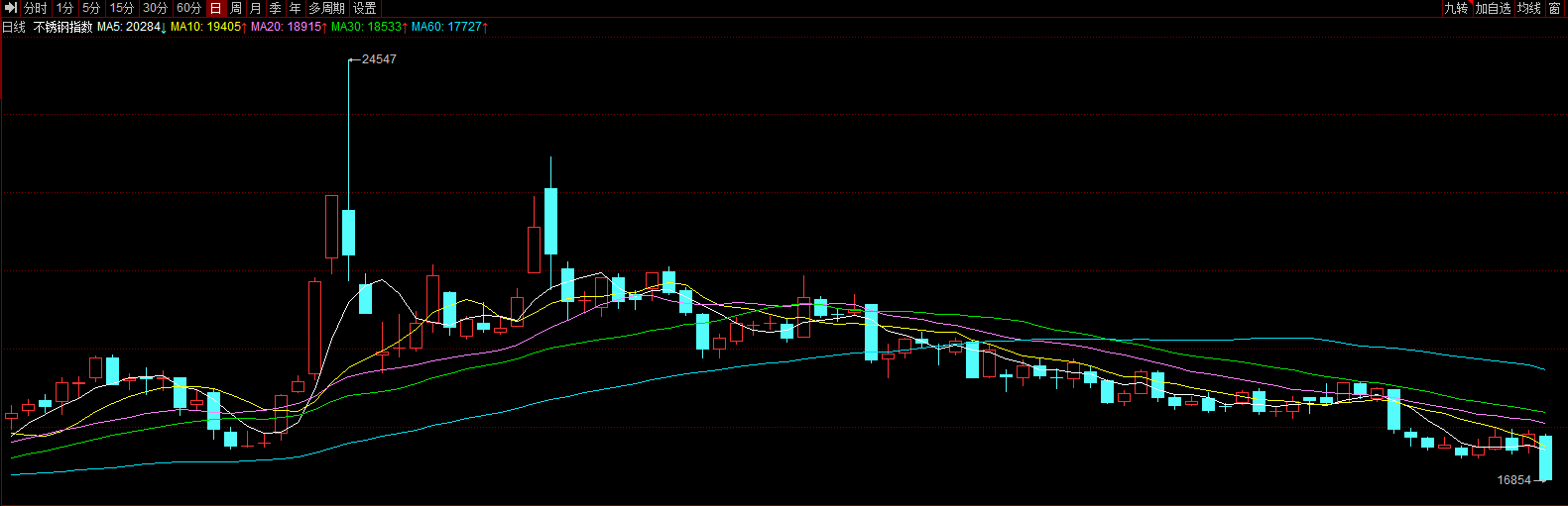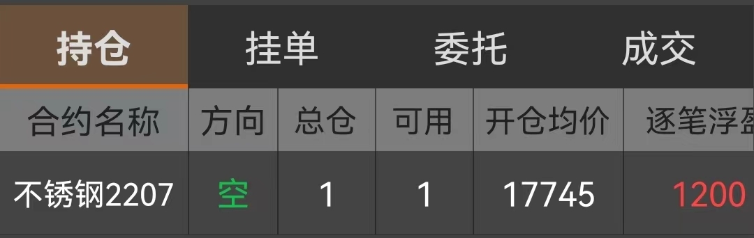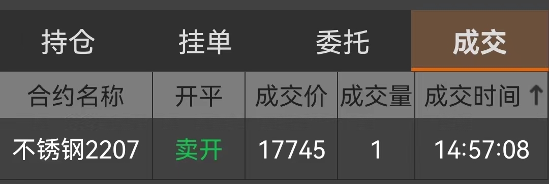 不锈钢2022年6月24不锈钢指数合约或主力合约下午收盘前,在日线上出现了一波横盘整理后的向下突破,6月24日收盘前价格合格,所以在14:57开空1手不锈钢2207合约,开仓价为17745。