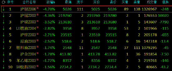 | 2月6日午盘收盘,国内期货主力合约涨跌不一,农产品期货领涨期市,金属期货领跌期市。生猪涨近3%,棕榈油涨超2%,焦煤、菜粕、菜油、豆粕、液化石油气(LPG)涨超1%。跌幅方面,沪银、沪锡跌超4%,沪镍跌超3%,低硫燃料油(LU)、沪锌、SC原油跌超2%。