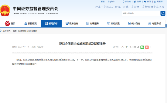 | 近日,证监会同意上海期货交易所合成橡胶期货及期权注册。下一步,证监会将督促上海期货交易所做好各项工作,保障合成橡胶期货及期权的平稳推出和稳健运行。