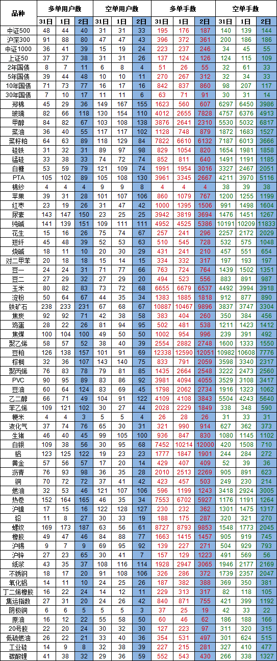 七禾网独家推出【高手持仓】栏目,七禾网收集整理了1000多位市场优秀盘手每日的品种持仓数据并进行分类,统计出国内期货市场活跃品种在当天持仓人数的多空比例以及各品种多单以及空单的持有手数,数据样本为七禾网整合的1000多位持续盈利盘手。