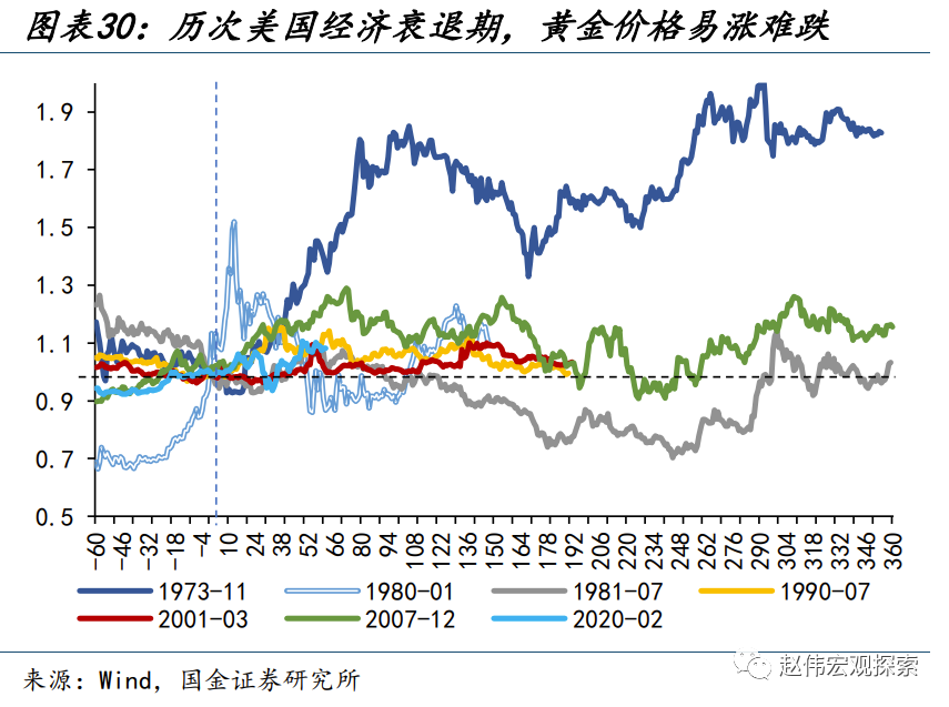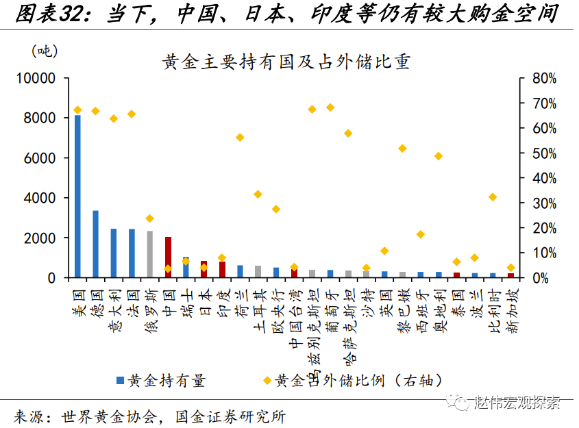 中长期来看,美债利率易降难升、经济衰退的担忧、央行购金的持续等,仍是对金价的有利支撑;短期向中枢的回归、或是为再度上行的“蓄力”。第一,历史回溯来看,最后一次加息到首次降息期间,美债利率的下行或是大势所趋。第二,经济下行阶段,黄金价格也多有较好的市场表现。第三,当下,中国、日本、印度、俄罗斯等经济体量较大的国家,黄金占外储比例仍然偏低,在地缘风险等担忧下,或仍将持续购入黄金。