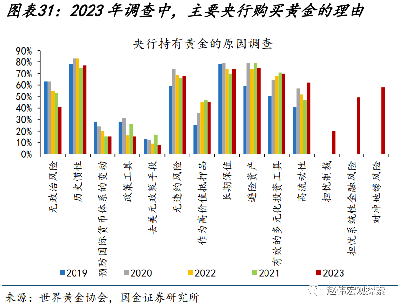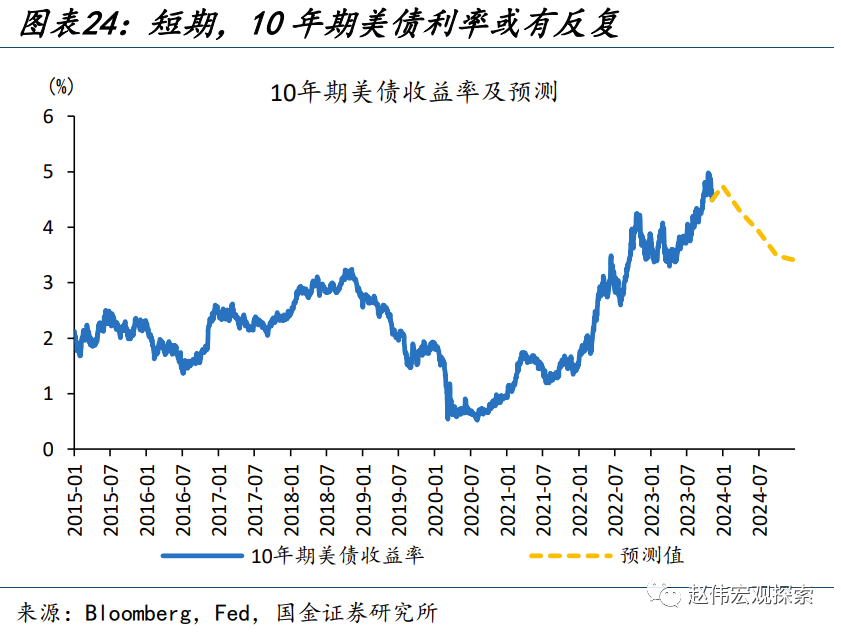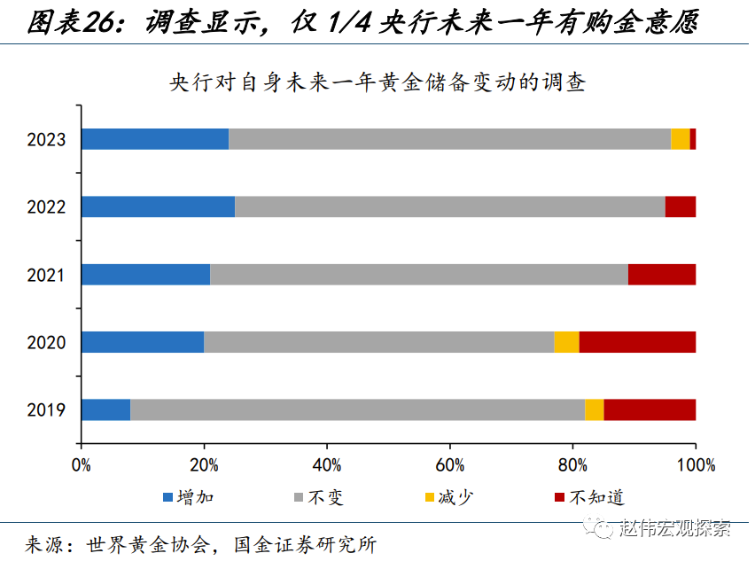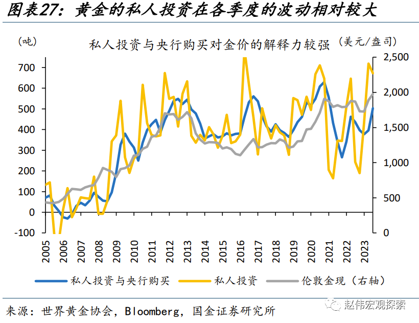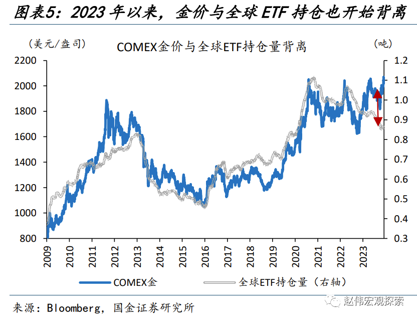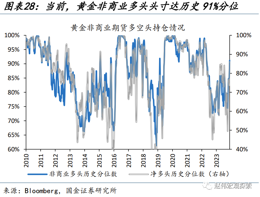 另一方面,避险情绪、主权货币信任下降等引发的居民投资行为,易在事件性冲击后往复,或也使金价短期承压。历史回溯来看,以央行与私人投资加总表征的黄金需求,与金价走势较为一致;其中,央行购金是一个“慢变量”、75%的央行认为明显未来一年黄金储备会不变或减少,而私人投资的波动则相对较大。近期,巴以冲突升温、穆迪下调美债展望等事件,或使得私人投资阶段性“超买”;而机构投资者方面,黄金非商业多头头寸也达到了91%的历史分位。居民端投资行为在短期或有往复,对金价形成压制。
