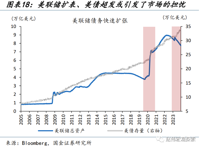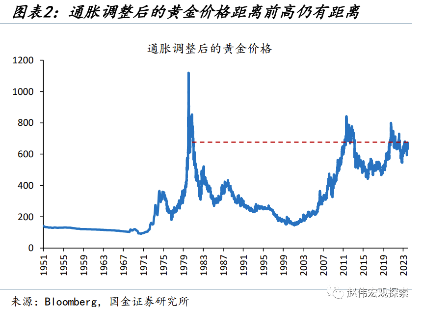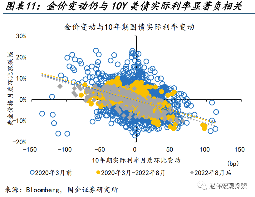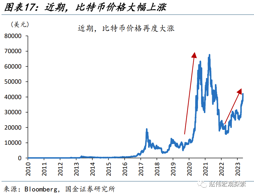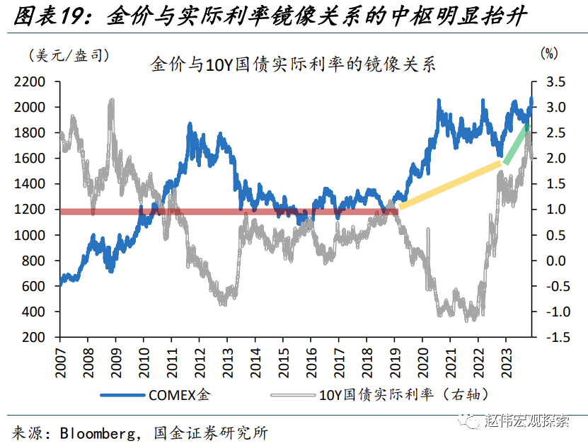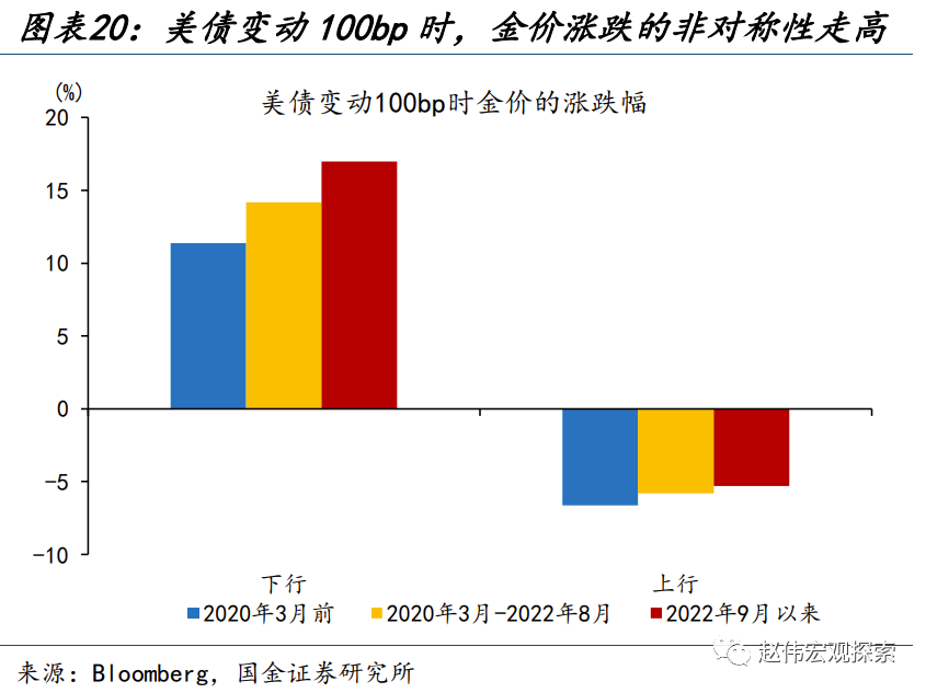 另一方面,滞后发布的“央行购金”与“居民投资”可能是抬升金价中枢的力量之一,而这或出于对主权货币的“长担忧”。以比特币的大涨来表征对“主权货币”信心的走弱:2020年3月,全球央行大放水,引发货币超发的担忧,比特币价格应声上涨;2022年下半年,美债上限危机不断升温,引发了对美元体系的“不信任”,比特币行情再度启动。而黄金的两阶段中枢抬升均发生在这一背景下:2020年3月以前、2020年3月-2022年8月、2022年8月以来,实际利率下行100bp,金价分别上涨11.4%、14.2%、17.0%;实际利率上行100bp,金价分别下跌6.6%、5.8%、5.3%,非对称性明显走强。