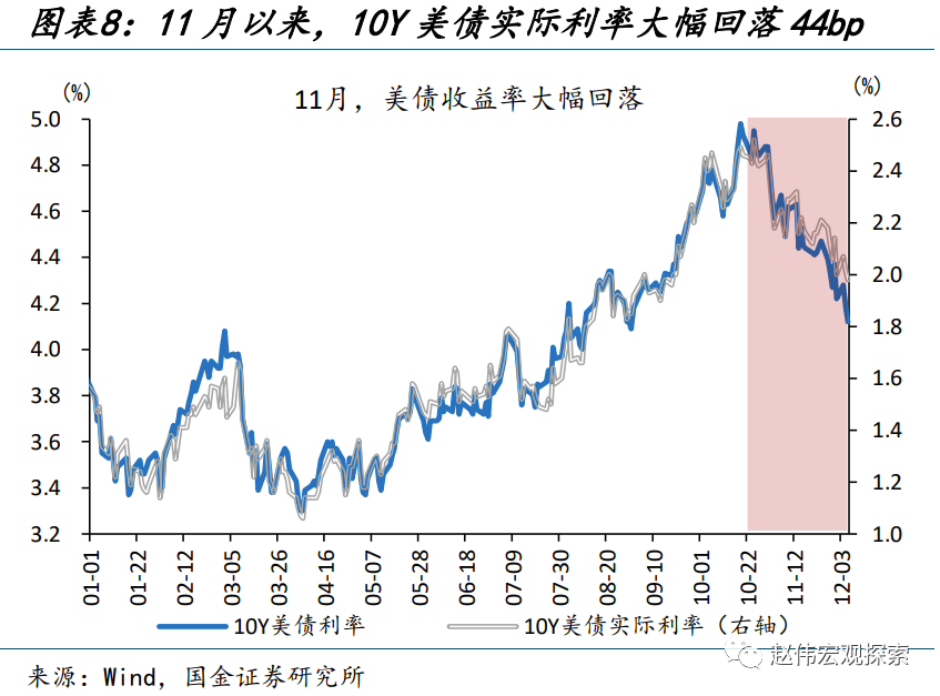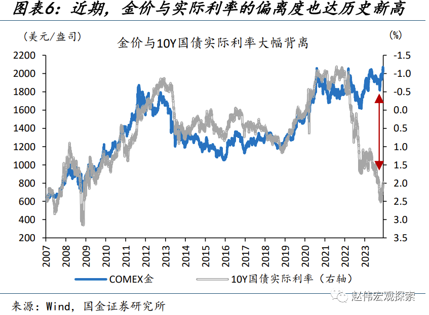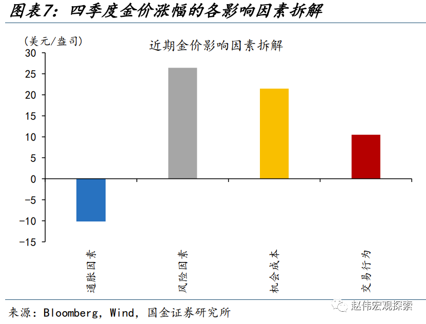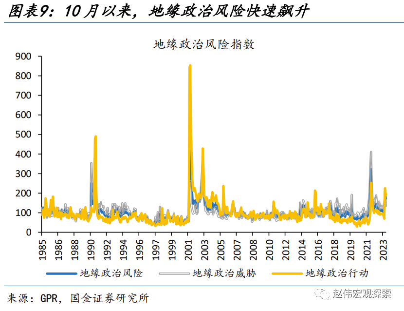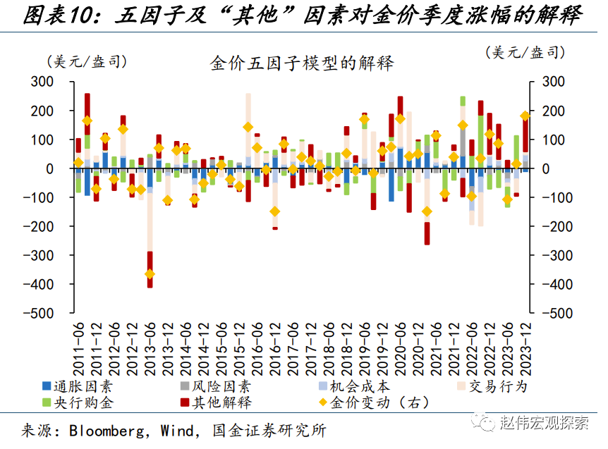 从模型“解释内”因素来看,避险情绪升温、实际利率回落是主要推动;但“解释外”因素在近期上涨中发挥了更为重要的作用。对模型各因子拆解来看,近期避险情绪与实际利率的回落是金价最有力的推手。一方面,11月以来,供求关系改善、经济数据走弱、投机扰动缓和的影响下,美债利率大幅回落,10Y美债实际利率由10月31日的2.46%回落至12月8日的2.02%、下行了44bp;另一方面,巴以冲突升级,地缘政治风险指数由9月末的99飙升至11月末的173,避险情绪升温也支撑了近期金价的大涨。但模型内因子仅能解释金价四季度181美元涨幅的三成,是什么带来了“解释外”的上涨?