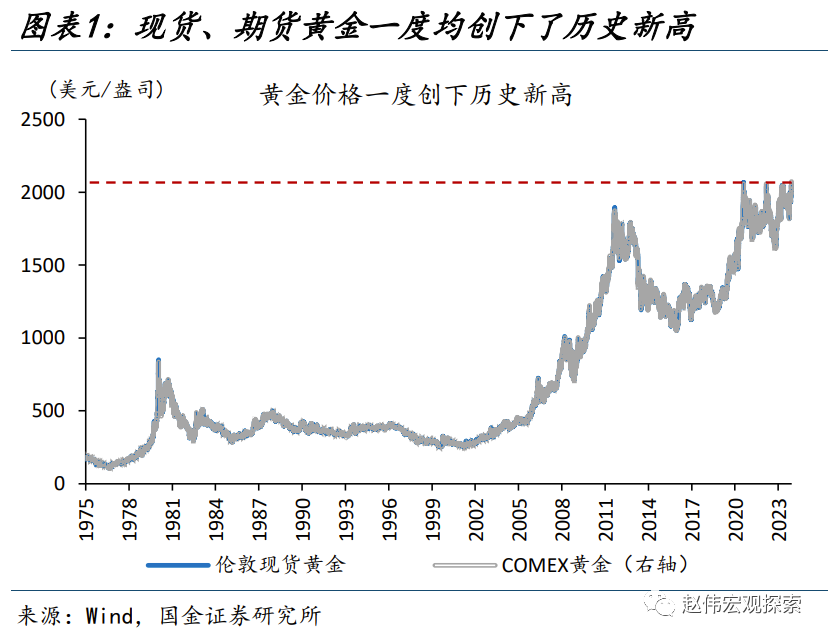 | 10月以来,黄金价格大涨,一度创下了历史新高,与其定价模型的“理论中枢”偏离度也达到了历史极值。定价模型为何失效,是“新变量”的冲击还是“老因子”的失灵,后续又将如何演绎?本文分析,可供参考。 热点思考:金价大涨,定价因子“失灵”了吗? 10月以来,金价大涨,一度创下了历史新高,与“理论中枢”偏离度也达历史极值。定价模型的失效,是“新变量”冲击还是“老因子”失灵,后续将如何演绎?供参考。 一问:近期黄金价格的“异军突起”?一度创下历史新高、与理论中枢大幅偏离 近期黄金价格大涨,一度创下了历史新高。10月6日以来,黄金价格快速飙升。截至12月8日,伦敦现货黄金、COMEX金价大涨10.3%,分别收于2008美元/盎司和2005美元/盎司。其中,COMEX金一度在12月1日涨至2152美元/盎司,既2022年3月、2023年5月两次挑战未果后、终于突破了2020年8月7日2089美元/盎司的前高,创下了历史新高。但从通胀调整后的金价来看,当下金价处于91%的历史分位、离前高仍有较大距离。