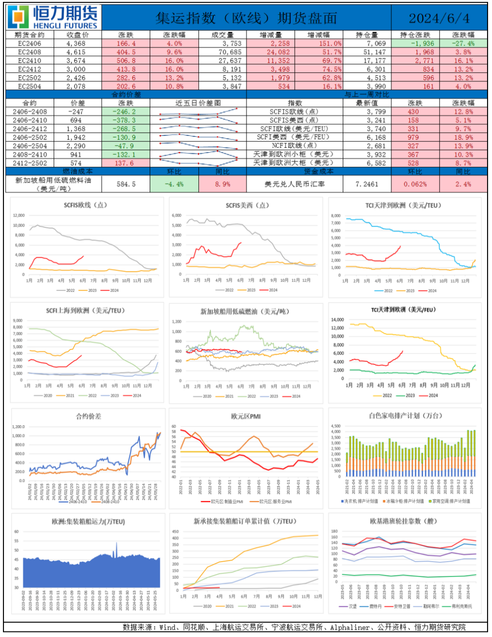 集运欧线 【方向】:近月偏多 【现货和盘面描述】: 6月3日盘后公布最新上海出口集装箱结算运价指数(SCFIS),其中欧线报3799点,比上期涨430/12.8%,美西报3241点,比上期涨158/5.1%。 今天所有合约大涨,其中10/12合约涨停,主力08合约收报4615点,涨9.6%。成交量也大涨,除2504合约外,其他合约成交量涨幅50%以上。 【逻辑】: 1.地缘,以色列:“已经接受”拜登“三步走”停火方案,但不会同意结束加沙冲突,要摧毁作为恐怖主义组织的哈马斯。 胡塞:获得伊朗武器,能够袭击范围扩大。 2.船司运价,近期船司大幅调涨运费。电商平台显示,大柜和小柜大部分都已售罄,舱位紧张。线上报价,马士基上海到鹿特丹,6月初小柜4714-5508美元,大柜6648-6690美元,反映小柜的短缺。 3.宏观:欧元区制造业PMI初值47.4,是23年3月以来的最高值,去年5月是44.6,同比涨6%。美国将于8月1日对一系列中国进口货品加征关税,从而带来的部分商品抢运出口,导致的集装箱运力紧缺。 4.周转端:新加坡港口的拥堵,造成船舶到港延期,运力紧平衡。 【策略】:08合约多单继续持有 【关注】:停火方案,船司涨价落地情况,SCFIS、SCFI指数 行业新闻: 1、金十数据6月4日讯,据半岛电视台,以色列总理办公室否认了美国媒体有关以色列总理内塔尼亚胡将于6月13日在美国国会发表讲话的报道。目前,要求以色列同意与哈马斯停火的压力越来越大。内塔尼亚胡的办公室告诉以色列媒体,他在美国国会发表演讲的日期“尚未最终确定”,但不会是6月13日,因为这与犹太节日有冲突。 2、金十数据6月4日讯,当地时间4日,一名巴勒斯坦伊斯兰抵抗运动(哈马斯)不具名领导人表示,哈马斯5日不会派遣代表团前往开罗,参与新的被扣押人员交换和停火协议相关谈判。该领导人表示,相关斡旋方向哈马斯提交了新提案,但是哈马斯并不接受。他强调,哈马斯不希望从头开始进行谈判,而是只需要以色列批准哈马斯在上一轮谈判中已同意的协议提案,否则没有必要再进行讨论。 3、以色列极右翼联盟连续第三天强烈反对美国斡旋的停火协议,财政部长比撒列·斯莫特里赫威胁说,如果总理接受该协议,他将“全力以赴”将内塔尼亚胡赶下台。 4、航运巨头马士基表示,由于地中海和亚洲港口的码头严重拥挤,我们的船舶时刻表将出现严重延误。这种拥堵导致各个港口的等待时间延长,影响了我们维持正常航班的能力。 责任编辑:七禾编辑 |