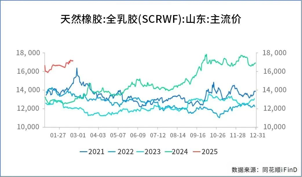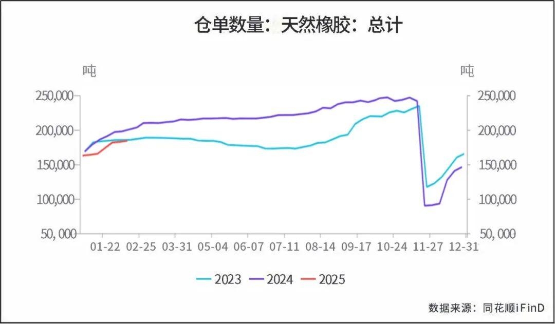 数据来源:同花顺、东航期货投资咨询部 库存方面,截至2025年2月14 日,国内天然橡胶社会库存为137万吨,环比增加0.67 万吨。2月14 日,上海期货交易所天然橡胶期货仓单为18.4 万吨,低于2024 年同期,与2023年同期基本相当。虽然期货仓单数量处于相对低位,但社会库存处于累库过程。社会库存的增加主要集中在贸易商环节,下游轮胎企业库存处于相对合理水平,这意味着后市天然橡胶价格在度过阶段性供应低谷期后仍有回落隐忧。 综上分析,笔者认为当前国内天然橡胶库存水平相对充裕,后市天然橡胶价格上行潜力料受限。预计沪胶2505合约价格的波动区间维持在16000-19000元/吨。 责任编辑:七禾编辑 |