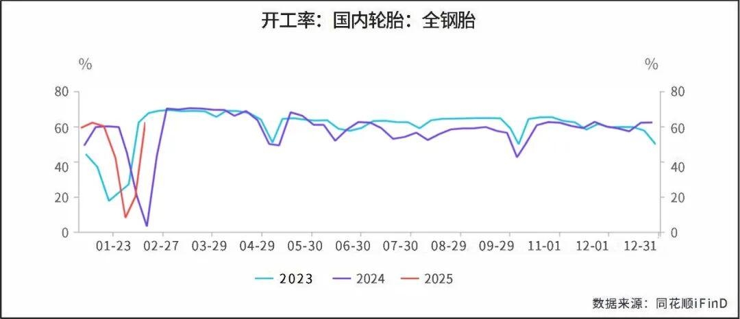 数据来源:同花顺、东航期货投资咨询部 在轮胎市场方面,节后轮胎企业陆续复工复产,产能利用率逐渐回暖。截至2月14日,国内半钢胎样本企业产能利用率为 73.85%,环比上涨 44.47个百分点,同比上涨29.99个百分点;全钢胎样本企业产能利用率为 62.45%,环比上涨 42.42个百分点,同比上涨 59.32个百分点。由于假期因素,轮胎企业开工率同比存在失真现象,开工率水平尚未达峰。从市场需求来看,随着汽车保有量的增加,轮胎替换市场需求相对稳定,但受汽车产销增速放缓影响,原配轮胎市场需求增长动力不足。这对天然橡胶后期涨势构成不利影响。