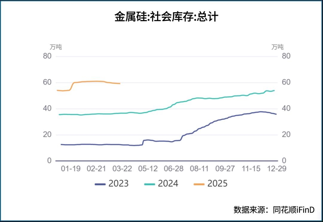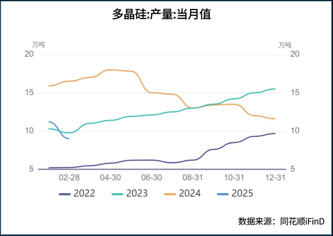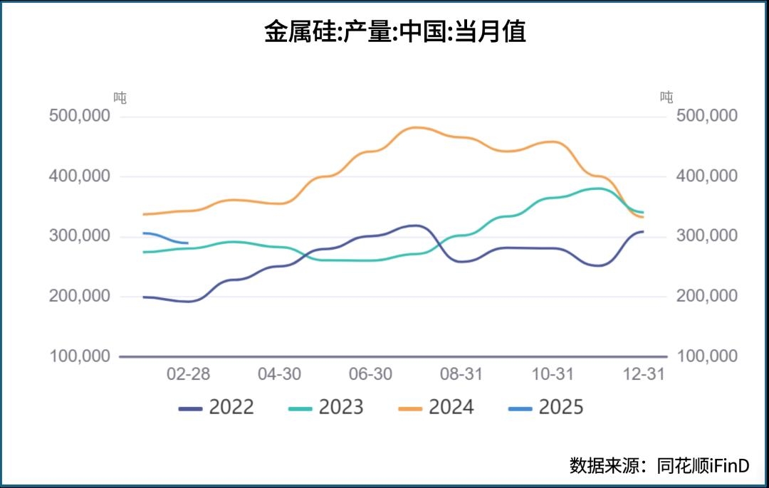 从下游需求来看,工业硅下游的主要消费市场多晶硅市场产量于2024年4月达到近年来顶峰,当期月产量高达18万吨/月,随后产量持续下滑。2025年1-2月,国内多晶硅产量为20.2万吨,去年同期为32.4万吨,同比下降约37.6%。在工业硅市场产能充足的情况下,下游需求减弱将在较长一段时间继续困扰工业硅价格复苏。