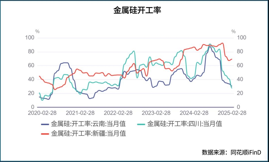 2025年1-2月份,国内金属硅市场表现为供需双弱格局。据中国有色金属工业协会(CNIA)公布数据,2024年我国工业硅产量创下历史记录,达到497万吨,较2023年增加约115万吨,同比增幅超过30%。若按月度平均产量核算,2024年我国工业硅月均产量超过了41万吨/月。进入到2025年,1-2月份我国工业硅累计产量约为59.4万吨,同比下降约14%。其中,在24年10月份之后云南和四川的金属硅开工率回落尤为显著,2月份两个地区的金属硅开工率回落到30%以内,金属硅开工率已经处于近三年的偏低开工率水平。一方面云南、四川地区受枯水季影响,电力成本攀升至0.55-0.65元/度,较丰水期的0.35-0.4元/度高出30%-60%,折合吨硅电力成本增加1,200-1,800元/吨。生产成本提高使得云南和四川两地金属硅开工率存在季节性回落特点。除此之外金属硅价格持续下跌,并跌破现金成本也是导致金属硅开工率持续下降的另一个重要原因。金属硅生产现金成本最低的地区是新疆地区,新疆凭借煤电0.25-0.3元/度成本优势,能够把金属硅现金成本控制到8500-9500元/吨区间。持续低迷的工业硅价格,在工业硅期货价格跌破10000元/吨后,新疆地区的金属硅开工率也出现了持续回落走势。截止2月份,新疆地区的金属硅开工率已滑落至70%下方。新疆、云南以及四川等地区的金属硅开工率持续下滑,已经使得金属硅产量走低。不过,金属硅产量的下降尚未阻止工业硅价格止跌走势。