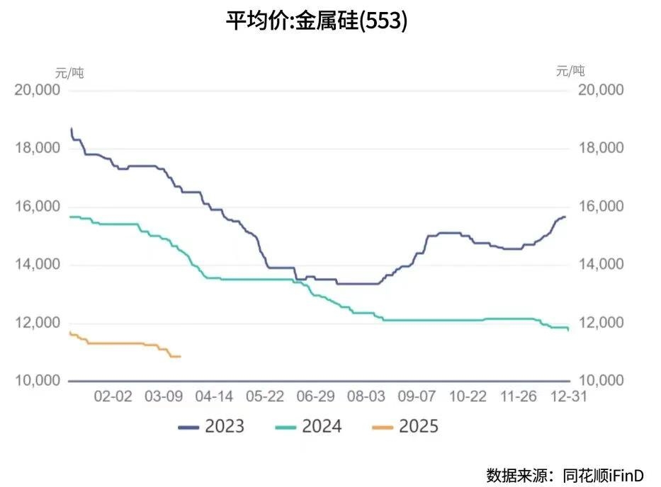 2025年一季度,工业硅期货市场延续弱势下跌走势,主力合约SI2505价格从1月初的11,000元/吨震荡下行,3月中旬跌破万元心理关口,最低探至9,625元/吨,较年内高点累计跌幅达12.5%。现货市场同步承压,长江有色金属硅553#报价从1月初的11,700元/吨回落,至3月下旬已下跌至10,850元/吨。