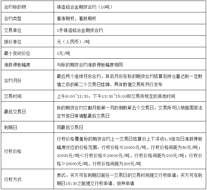 数据来源:同花顺,东航期货投资咨询部 铸造铝合金价格与原铝价格通常具有高度相关性,两者相关系数超过0.9。通常情况下,两者价差区间在±10%区间内波动。上海期货交易所铸造铝合金期货的推出,将与沪铝期货形成套利通道。 四、铸造铝合金期权合约介绍 上海期货交易所铸造铝合金期货期权合约(征求意见稿)如下: 表2