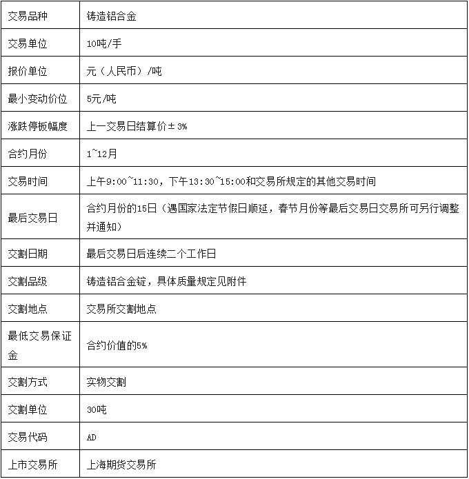 | 在全球经济格局不断演变以及有色金属市场持续发展的大背景下,期货市场作为重要的风险管理与价格发现平台,其新品种的推出往往备受瞩目。2025年4月25日,上海期货交易所发布公告,就铸造铝合金期货合约、期权合约和业务细则公开征求意见,这一举动标志着铸造铝合金期货的上市进程正式提上日程,我国金属类期货期权衍生品序列将迎来新成员,铝产业链风险管理体系也将迈向新的发展阶段。 一、合约介绍 上海期货交易所铸造铝合金期货合约(征求意见稿)如下: