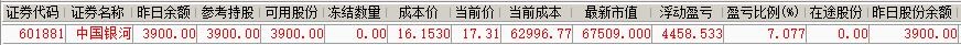 | 账户初始资金:49568.55元 参考市值:67509.00元 账户资产:67605.82元 截至今日账户A股盈亏:18037.27元 账户净值:1.363 资金股份