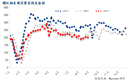 回顾Mysteel建筑钢材全样本口径数据,2024年8月,螺纹钢市场的表观消费量周均值在204.01万吨,全月最高值在215.62万吨。2025年8月份,周均值200.63万吨左右,表观消费量周度最高在210.79万吨,周均较去年同期低1.66%,降幅收窄。8月份市场市场整体需求表现一般,在传统淡季中保持了稳步增长的水平,9月份虽然“金九银十”的概念淡化,但需求仍有季节性的恢复。 Mysteel建筑企业调研数据显示,2025年8月实际钢材采购量579万吨,较预计采购量减少0.4%,实际采购量月环比增加3%;9月份企业计划钢材采购量613万吨,根据8月份实际采购量、商家计划采购量以及当前市场表现来预估,9月份实际采购量月环比或将增加5%左右。