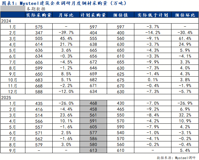 | 报告品种:螺纹钢 原文链接:https://gc.mysteel.com/a/25091208/8C67C60DD1151D7A.html 概述:8月份高温多雨天气有所缓解,加之个别区域有停工预期前的赶工现象,建筑施工企业的采购量环比有所增加。9月份虽然有区域短暂停工,但影响相对有限,且季节性需求恢复,终端整体需求进一步释放,加之当前部分行业资金到位率继续回升,因此预计9月份建筑企业钢材的采购量会增加约5%。