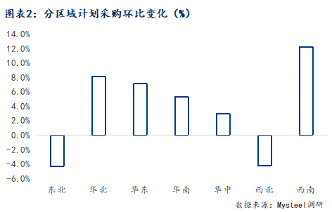 8月份样本企业全国建筑钢材的总采购量环比小幅增加,各区域有表现不一,西北、西南和东北区域负增长,幅度分别为-3.57%、-1.8%、-1%,其他区域采购量均是增加的状态,尤其是,尤其是华北、华南区域,增幅在15%以上,其他区域也有近5%的增幅。本期调研内,各区域需求计划略有不同,但除了东北、西北有4%左右的负增长外,其他区域都处于增长状态,不过整体增幅不大,且增幅多在5-10%。