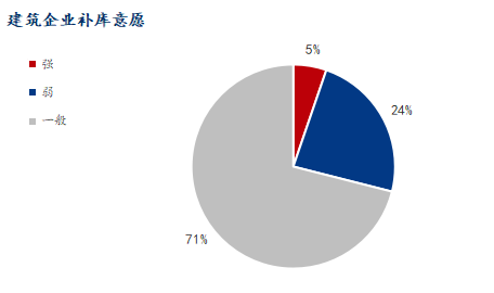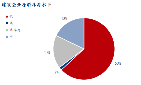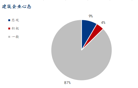 定性指标反馈:建筑企业原料库存水平中“无库存”比例、“低库存”比例较上期微降;补库意愿“高”、补库意愿“低”的比例均有所下降;此外,建筑企业心态“悲观”的比例也再次上升(具体表现见下图)。这也反映了市场对未来仍有很强的不确定性,当前企业依旧倾向于保持低库存的状态,多根据项目需求进行采购。