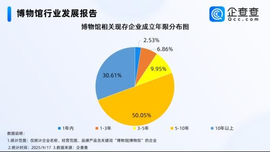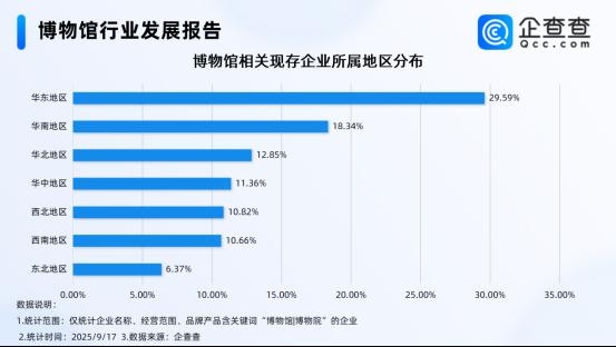| 9月16日,商务部等9部门对外发布《关于扩大服务消费的若干政策措施》提出五方面19条举措,其中包括,因地制宜延长热门文博场馆、景区营业时间,优化预约方式,鼓励推行免预约;支持文博场馆创新办展方式,其收益可按规定用于绩效激励,根据工作成效合理核定绩效工资总量。鼓励文博单位开放馆藏资源,与社会力量合作开发文创、数字产品,推动市场化方式举办的各类文化展览进商场、进社区、进公园等。 今年以来,“博物馆热”持续升温,各地博物馆通过延长开放时间、推出特色夜间活动、创新文创周边等方式频繁出圈,有效带动了消费、促进了文化传播。每逢节假日,多地城市的博物院成为人们出游热门打卡点,游客常达限流峰值,人气爆棚。 企查查数据显示,截至9月中旬,国内博物馆相关现存企业达1.16万家,主要分布在华东地区,占比达29.59%。从成立年限来看,超8成相关企业成立超5年,其中成立年限在5-10年的相关企业最多,占比达50.05%。注册量方面,2021年-2024年相关企业每年注册量维持在250家-600家之间,2024年注册量达291家,截至目前今年已注册148家,今年新注册的博物馆相关企业多分布在三线、二线城市。 1、国内博物馆相关现存企业达1.16万家