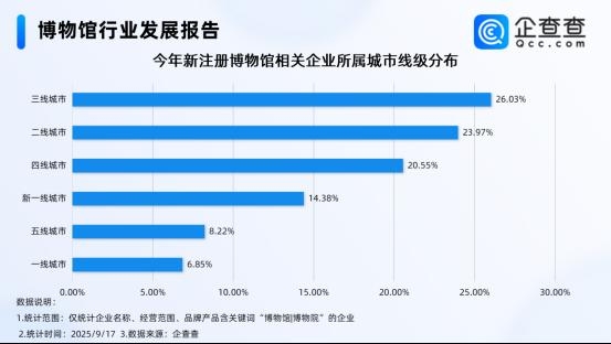 企查查数据显示,从成立年限来看,国内博物馆相关现存企业中,超8成相关企业成立超5年,其中成立年限在5-10年的相关企业最多,占比达50.05%,成立年限在10年以上的相关企业,占比达30.61%。 3、今年新注册相关企业多分布在三、二线城市