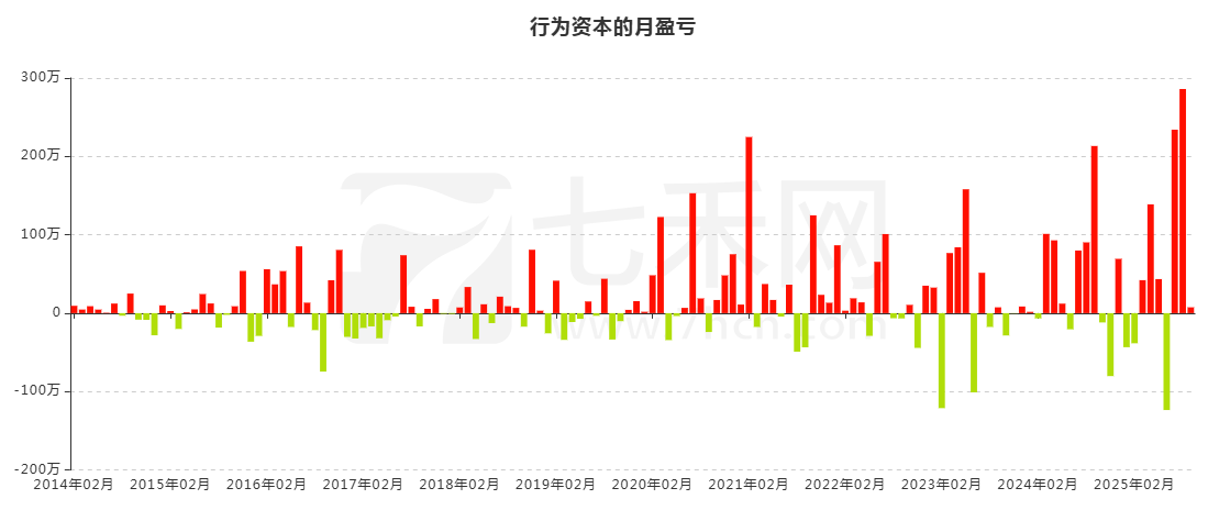 从月盈亏来看,账户累计交易140个月,其中盈利86个月,亏损54个月,最高一个月盈利近286万,亏损最多的一个月亏123万。
