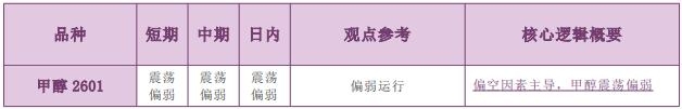 备注: 1.有夜盘的品种以夜盘收盘价为起始价格,无夜盘的品种以昨日收盘价为起始价格,当日日盘收盘价为终点价格,计算涨跌幅度。 2.跌幅大于 1%为下跌,跌幅 0~1%为震荡偏弱,涨幅 0~1%为震荡偏强,涨幅大于1%为上涨。 3.震荡偏强/偏弱只针对日内观点,短期和中期不做区分。 主要品种价格行情驱动逻辑—商品期货能源化工板块 甲醇(MA) 日内观点:震荡偏弱 中期观点:震荡偏弱 参考观点:偏弱运行 核心逻辑:随着制裁伊朗甲醇船只事件被市场消化以后,利多驱动减弱。当前国内甲醇开工率和周度产量依然维持偏高水平,外部进口压力持续增大,年内进口峰值已经到来,由此导致节前华东和华南港口甲醇库存居高不下。虽然下游需求逐渐好转,不过烯烃盘面利润不佳,弱需现状仍待改善。面临中期下行趋势压制,本周三夜盘,国内甲醇期货 2601 合约略微收低0.22%至2287 元/吨。在产业因子乏力的背景下,预计本周四国内甲醇期货 2601 合约或维持震荡偏弱的走势。 责任编辑:七禾编辑 |