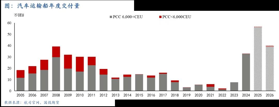 四、汽车运输船对集运货量的分流 除传统集运船舶外,另一股影响欧线供应格局的力量来自汽车滚装船的集中交付。 此前,由于中国电动汽车出口爆发式增长,而汽车运输船运力不足、新船建造周期长,大量汽车选择通过集装箱船进行运输。2024年以来,汽车运输船下水速度明显加快,其中不少被部署在欧洲航线。目前下水的多为6,000+CEU(标准车位数)级别的船舶,若以每40尺集装箱装运3辆汽车估算,单艘此类汽车船一次航程相当于分流了超过4,000TEU的集装箱货量。 随着后续更多汽车船投入运营,汽车海运运力将得到快速补充,预计将逐步分流目前通过集装箱船运输的电动汽车货量,从而减弱其对集运欧线需求端的拉动作用。